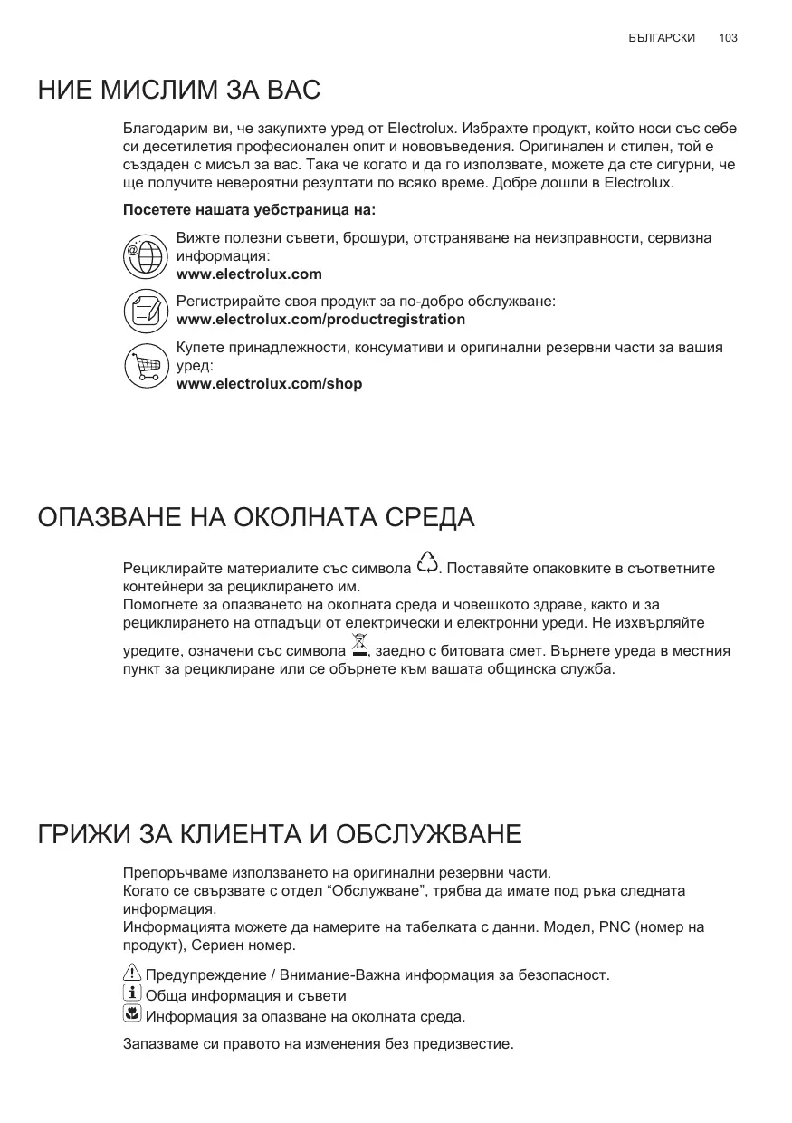 НИЕ МИСЛИМ ЗА ВАС Благодарим ви, че закупихте уред от Electrolux. Избрахте продукт, който носи със себе си десетилетия професионален опит и нововъведения. Оригинален и стилен, той е създаден с мисъл за вас. Така че когато и да го използвате, можете да сте сигурни, че ще получите невероятни резултати по всяко време. Добре дошли в Electrolux. Посетете нашата уебстраница на: Вижте полезни съвети, брошури, отстраняване на неизправности, сервизна информация: www.electrolux.com Регистрирайте своя продукт за по-добро обслужване: www.electrolux.com/productregistration Купете принадлежности, консумативи и оригинални резервни части за вашия www.electrolux.com/shop ОПАЗВАНЕ НА ОКОЛНАТА СРЕДА Рециклирайте материалите със символа . Поставяйте опаковките в съответните контейнери за рециклирането им. Помогнете за опазването на околната среда и човешкото здраве, както и за рециклирането на отпадъци от електрически и електронни уреди. Не изхвърляйте уредите, означени със символа , заедно с битовата смет. Върнете уреда в местния пункт за рециклиране или се обърнете към вашата общинска служба. ГРИЖИ ЗА КЛИЕНТА И ОБСЛУЖВАНЕ Препоръчваме използването на оригинални резервни части. Когато се свързвате с отдел “Обслужване”, трябва да имате под ръка следната информация. Информацията можете да намерите на табелката с данни. Модел, PNC (номер на продукт), Сериен номер. Предупреждение / Внимание-Важна информация за безопасност. Обща информация и съвети Информация за опазване на околната среда. Запазваме си правото на изменения без предизвестие.