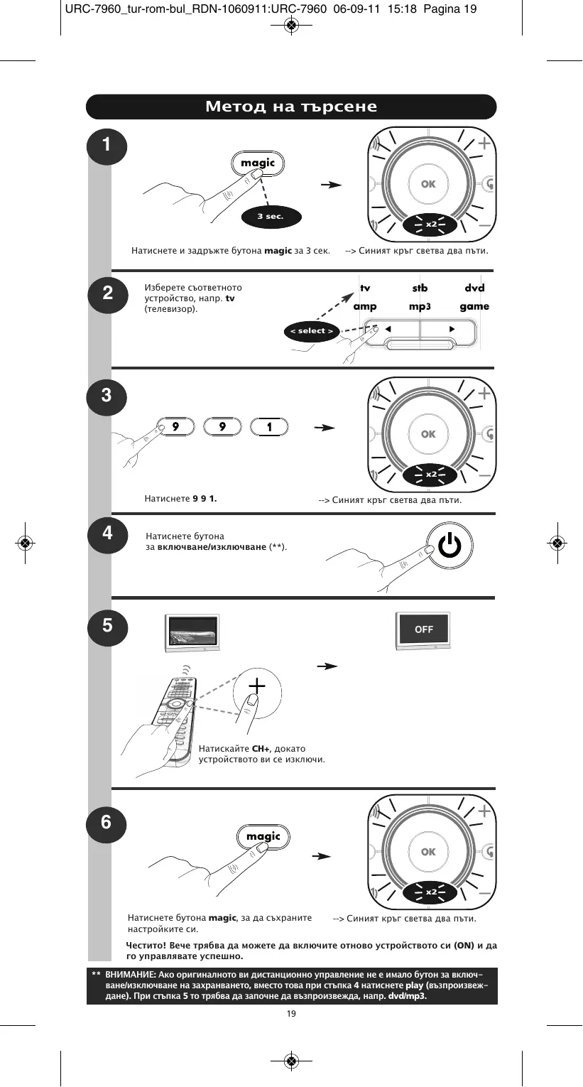 Честито! Вече трябва да можете да включите отново устройството си (ON) и да го управлявате успешно. * ВНИМАНИЕ: Ако оригиналното ви дистанционно управление не е имало бутон за включване/изключване на захранването, вместо това при стъпка 5 натиснете pause (пауза). Моля, стартирайте възпроизвеждането на dvd/mp3, преди да осъществите директна настройка на код. 18
