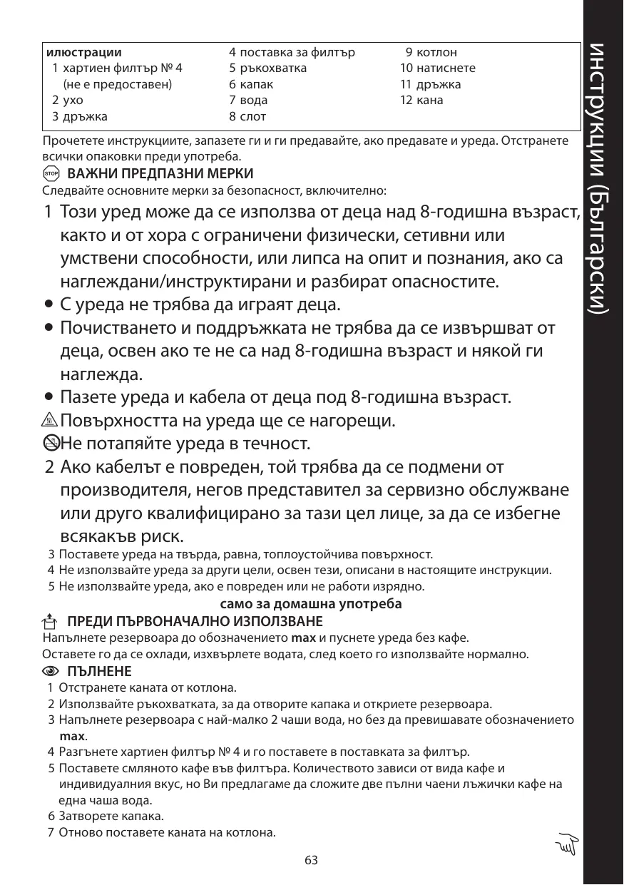 - Пазете уреда и кабела от деца под 8-годишна възраст. h Повърхността на уреда ще се нагорещи. lНе потапяйте уреда в течност. 2 Ако кабелът е повреден, той трябва да се подмени от производителя, негов представител за сервизно обслужване или друго квалифицирано за тази цел лице, за да се избегне всякакъв риск. 3 Поставете уреда на твърда, равна, топлоустойчива повърхност. 4 Не използвайте уреда за други цели, освен тези, описани в настоящите инструкции. 5 Не използвайте уреда, ако е повреден или не работи изрядно. само за домашна употреба U ПРЕДИ ПЪРВОНАЧАЛНО ИЗПОЛЗВАНЕ Напълнете резервоара до обозначението max и пуснете уреда без кафе. Оставете го да се охлади, изхвърлете водата, след което го използвайте нормално. C ПЪЛНЕНЕ 1 Отстранете каната от котлона. 2 Използвайте ръкохватката, за да отворите капака и откриете резервоара. 3 Напълнете резервоара с най-малко 2 чаши вода, но без да превишавате обозначението max. 4 Разгънете хартиен филтър № 4 и го поставете в поставката за филтър. 5 Поставете смляното кафе във филтъра. Количеството зависи от вида кафе и индивидуалния вкус, но Ви предлагаме да сложите две пълни чаени лъжички кафе на една чаша вода. 6 Затворете капака. 7 Отново поставете каната на котлона.