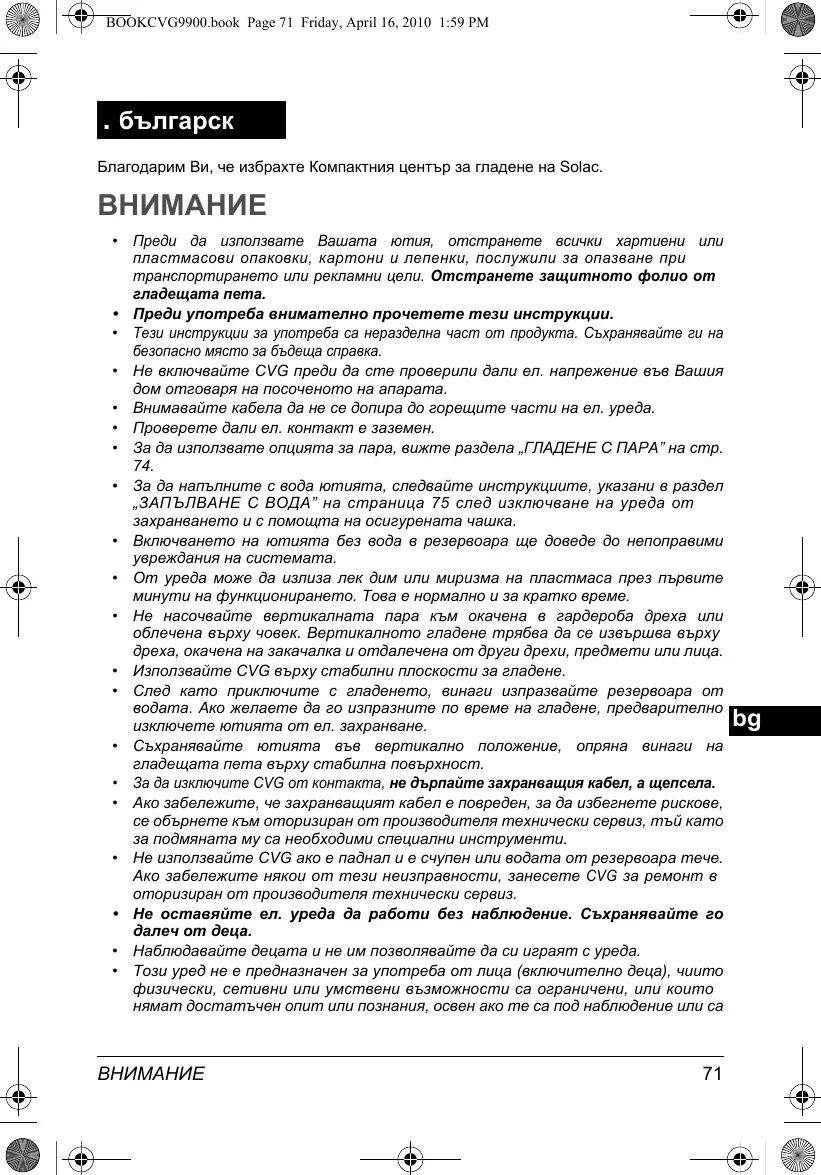 - Solac не носи отговорност за повреди във Вашия ел. уред, породени от неспазване на гаранцион ните условия или на инструкциите за работа и подръжка, които се прилагат към Инструкцията за експлоатация на всеки ел. уред.