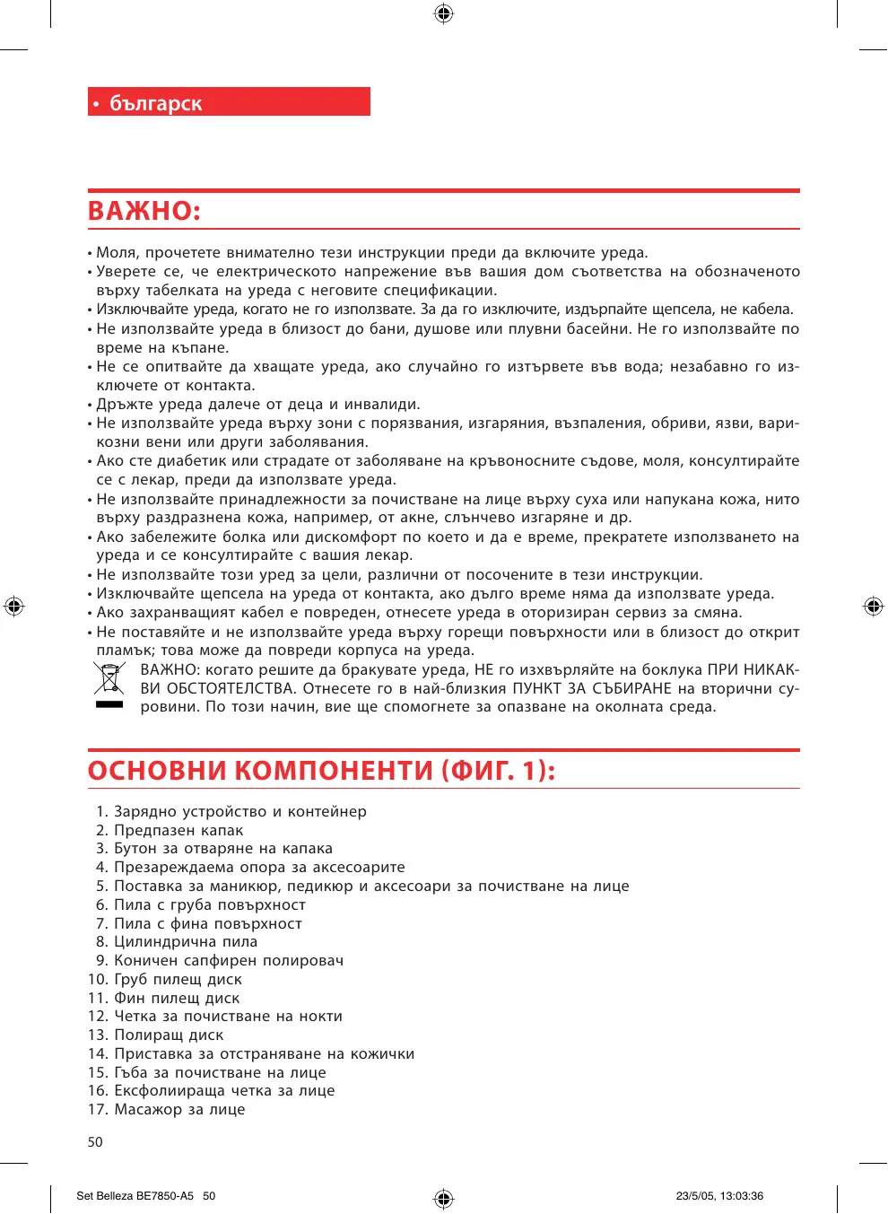 Изтеглете инструкциите за вашия Уред за красота в PDF формат безплатно! Намерете ръководството си BE7850 - SOLAC и вземете отново електронното си устройство в ръце. На тази страница са публикувани всички документи, необходими за използването на вашето устройство. BE7850 на марката SOLAC.