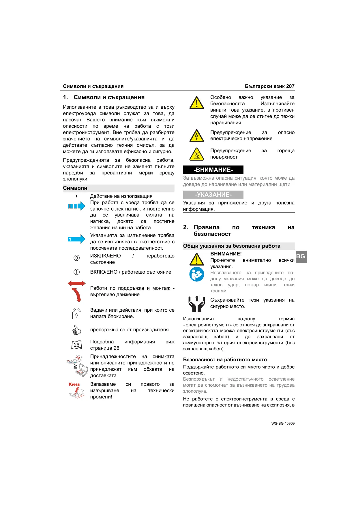 щепсела от контакта на ел. мрежа, ако кабелът се повреди по време на Повредените кабели увеличават риска от електрически удар. Други рискове. Макар че в ръководствата за експлоатация на нашите електроинструменти са посочени добробни указания за безопасна работа с електроинструментите, при работа свсеки електроинструмент има и други рискове, които не не са изключени дори и при наличието на WS-BG / 0909 Правила по техника на безопасност защитни приспособления Поради тази причина работете винаги с особена предпазливост с електроинструмента! Описание на уреда
