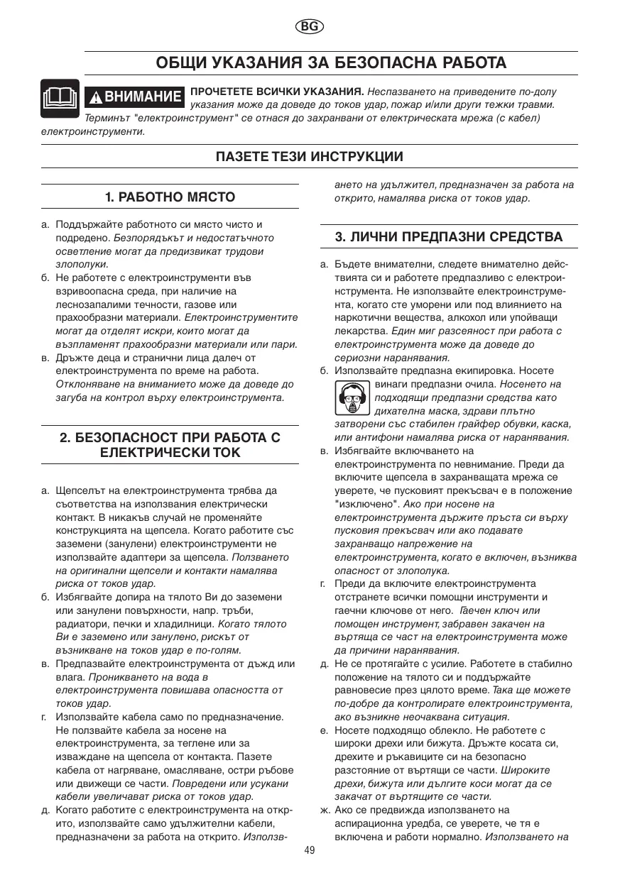 2. SECURITE ELECTRIQUE a. La fiche de l’outil électroportatif doit être appropriée à la prise de courant. Ne modifiez en aucune circonstance la fiche. N’employez pas d’adaptateur avec les outils électroportatifs mis à la terre. L’utilisation de fiches non modifiées et de prises appropriées réduira le risque de choc électrique. b Evitez tout contact corporel avec des éléments reliés à la terre, tels que tuyauterie, radiateurs, cuisinières, réfrigérateurs. La mise à la terre du corps accroît le risque de choc
