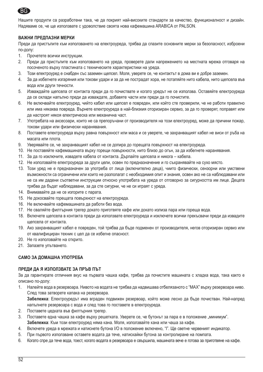 РЪКОВОДСТВО ЗА ПОТРЕБИТЕЛЯ ARABICA PALSON