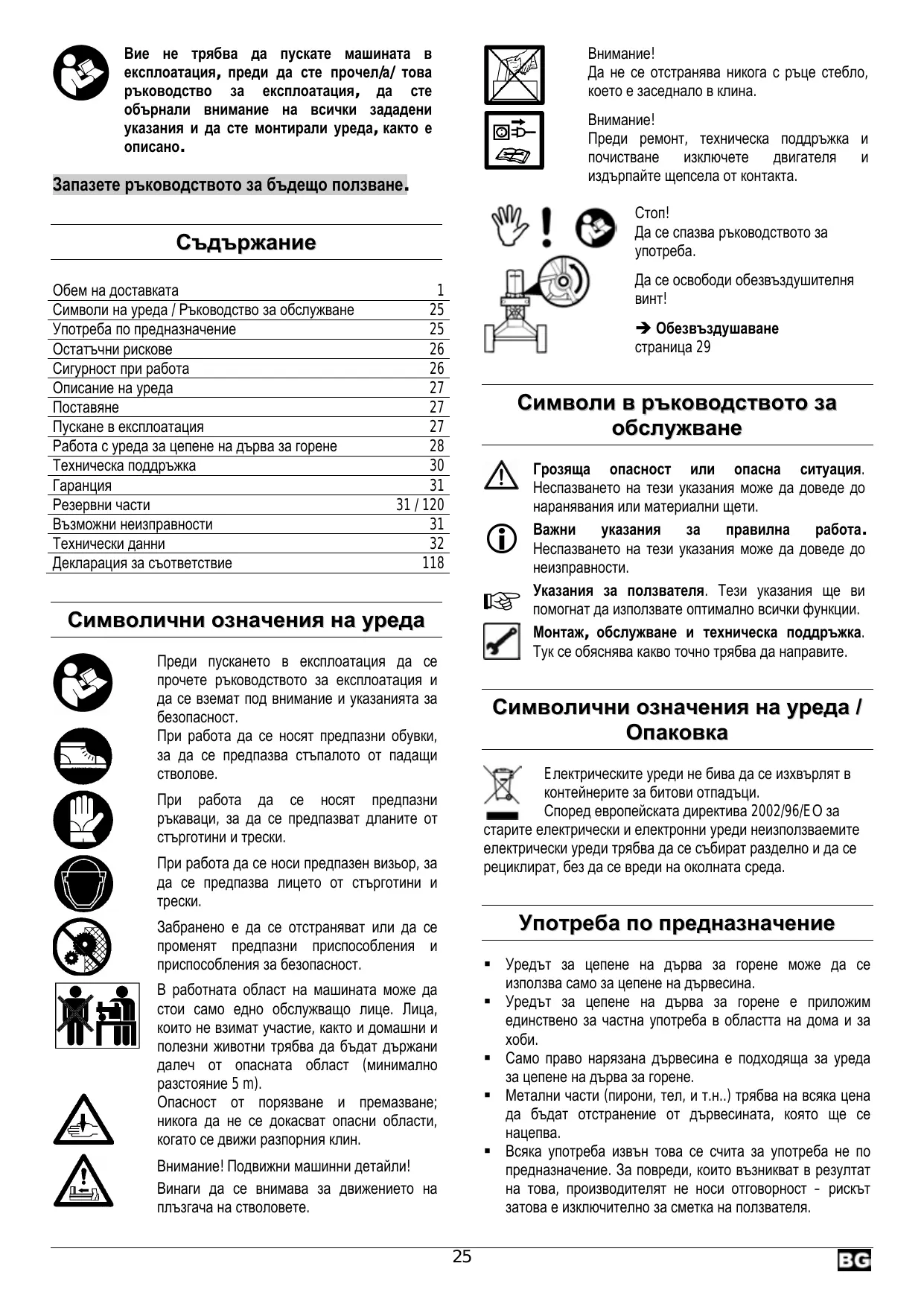 Обем на доставката Символи на уреда / Ръководство за обслужване Употреба по предназначение Остатъчни рискове Сигурност при работа Описание на уреда Пускане в експлоатация Работа с уреда за цепене на дърва за горене Техническа поддръжка Резервни части Възможни неизправности Технически данни Декларация за съответствие Да се освободи обезвъздушителня