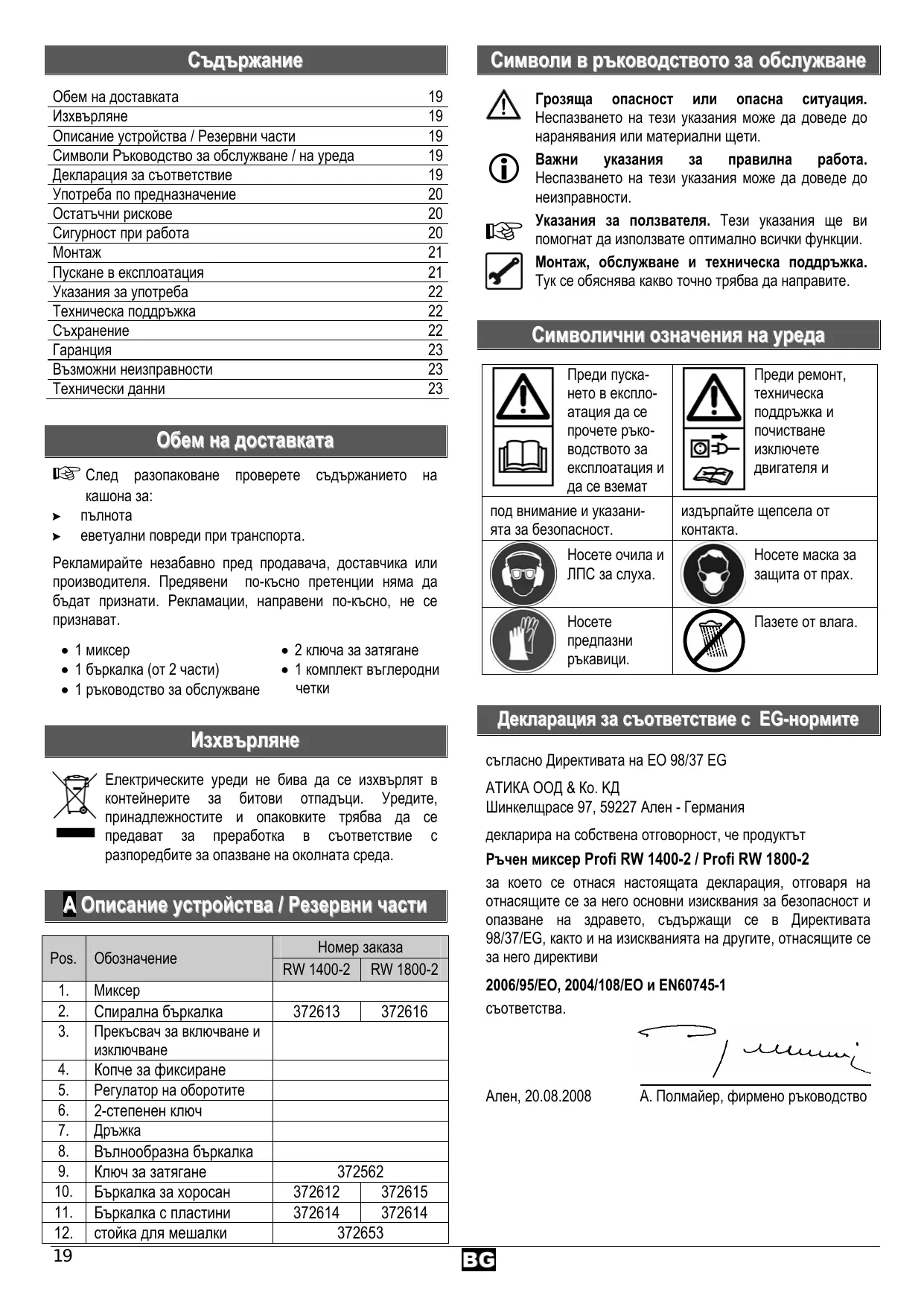 АТИКА ООД & Ко. KД Шинкелщрасе 97, 59227 Ален - Германия декларира на собствена отговорност, че продуктът Ръчен миксер Profi RW 1400-2 / Profi RW 1800-2 за което се отнася настоящата декларация, отговаря на отнасящите се за него основни изисквания за безопасност и опазване на здравето, съдържащи се в Директивата 98/37/EG, както и на изискванията на другите, отнасящите се за него директиви 2006/95/EО, 2004/108/EО и EN60745-1 съответства.