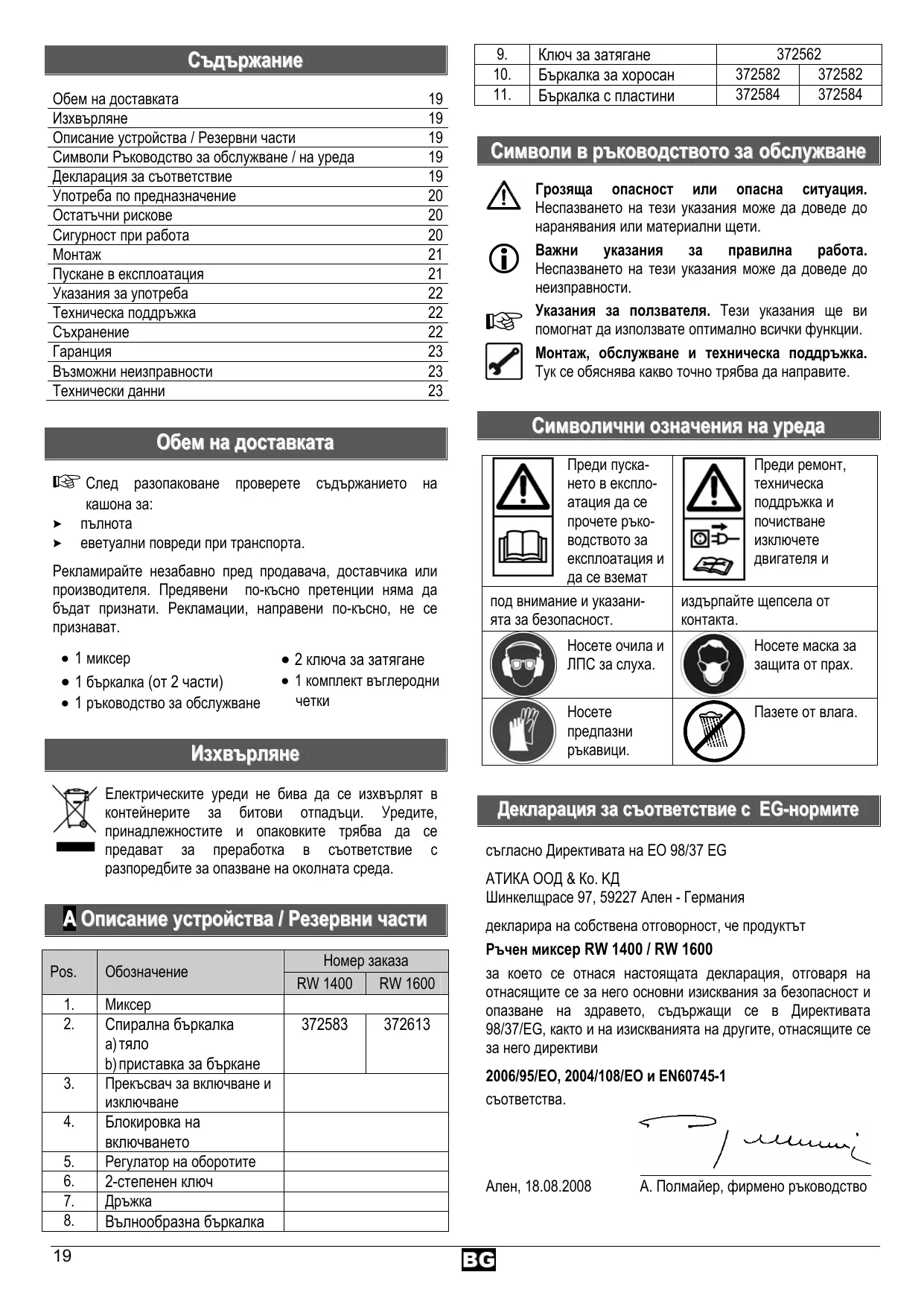 Декларация за съответствие с EG-нормите съгласно Директивата на ЕО 98/37 EG АТИКА ООД & Ко. KД Шинкелщрасе 97, 59227 Ален - Германия декларира на собствена отговорност, че продуктът Ръчен миксер RW 1400 / RW 1600 за което се отнася настоящата декларация, отговаря на отнасящите се за него основни изисквания за безопасност и опазване на здравето, съдържащи се в Директивата 98/37/EG, както и на изискванията на другите, отнасящите се за него директиви 2006/95/EО, 2004/108/EО и EN60745-1 съответства.