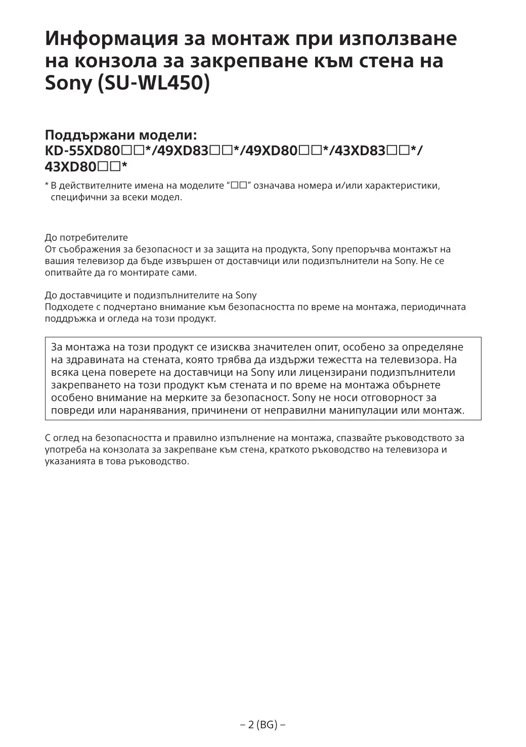 До потребителите От съображения за безопасност и за защита на продукта, Sony препоръчва монтажът на вашия телевизор да бъде извършен от доставчици или подизпълнители на Sony. Не се опитвайте да го монтирате сами. До доставчиците и подизпълнителите на Sony Подходете с подчертано внимание към безопасността по време на монтажа, периодичната поддръжка и огледа на този продукт.