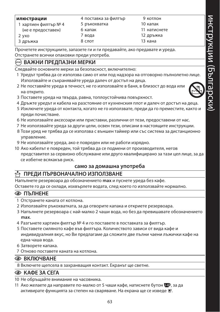 27 La piastra manterrà il caffè in caldo per due ore. 28 In questo intervallo di tempo, il simbolo X sul display lampeggerà. 4 Abra un filtro de papel del nº4 y colóquelo en el soporte del filtro. 5 Ponga café molido en el filtro. La cantidad variará en función del tipo de café y los gustos individuales, pero recomendamos 2 cucharadas pequeñas por cada vaso de agua. 6 Cierre la tapa. 7 Vuelva a colocar la jarra en la placa.