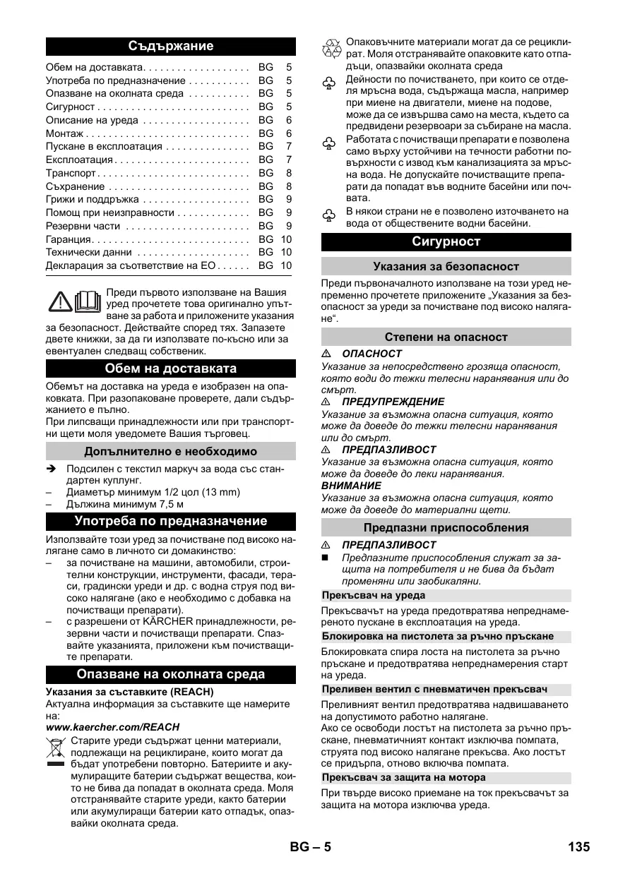 Употреба по предназначение Използвайте този уред за почистване под високо налягане само в личното си домакинство: – за почистване на машини, автомобили, строителни конструкции, инструменти, фасади, тераси, градински уреди и др. с водна струя под високо налягане (ако е необходимо с добавка на почистващи препарати). – с разрешени от KÄRCHER принадлежности, резервни части и почистващи препарати. Спазвайте указанията, приложени към почистващите препарати.