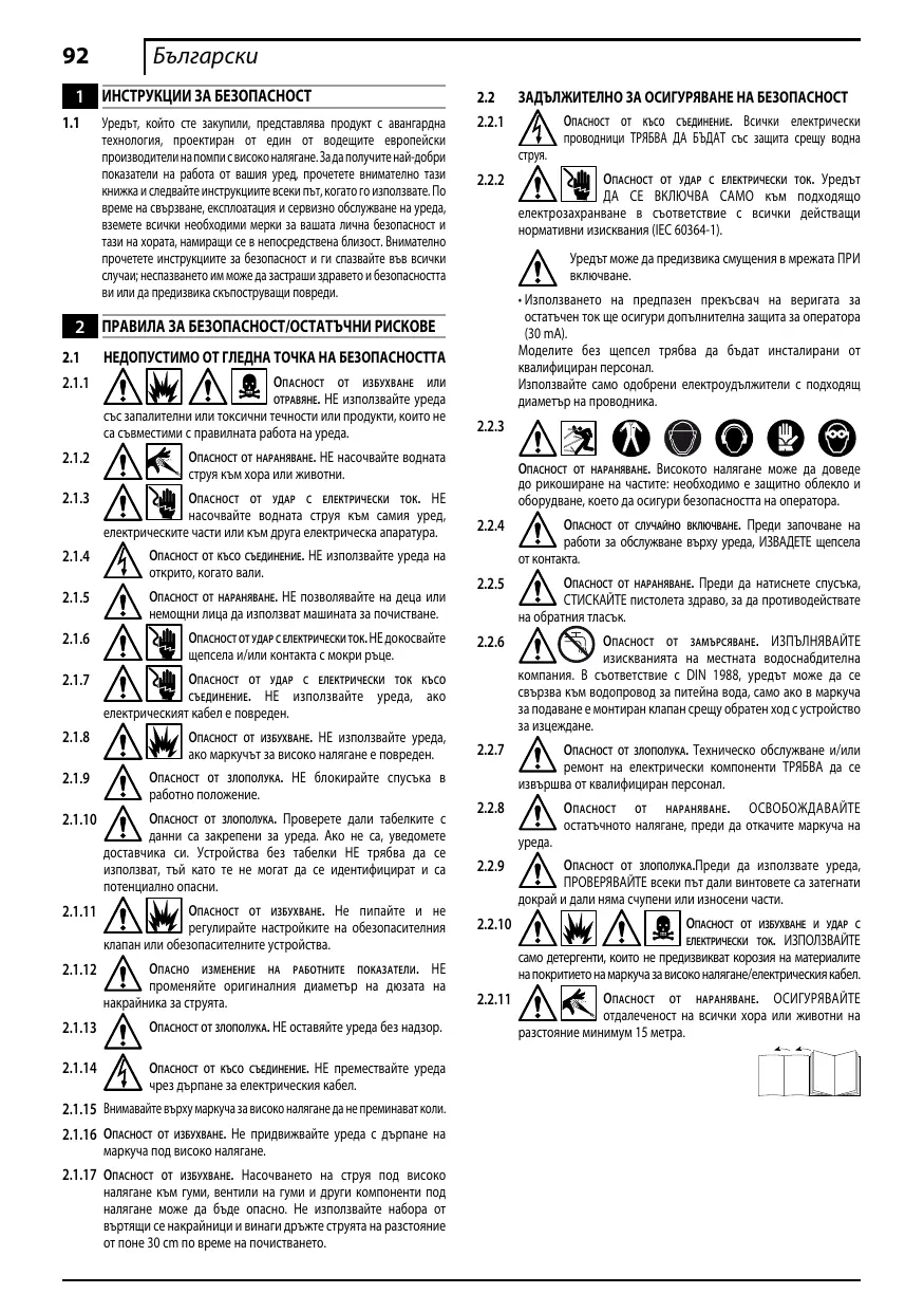 2.2.3 Опасност от нараняване. Високото налягане може да доведе до рикоширане на частите: необходимо е защитно облекло и оборудване, което да осигури безопасността на оператора.