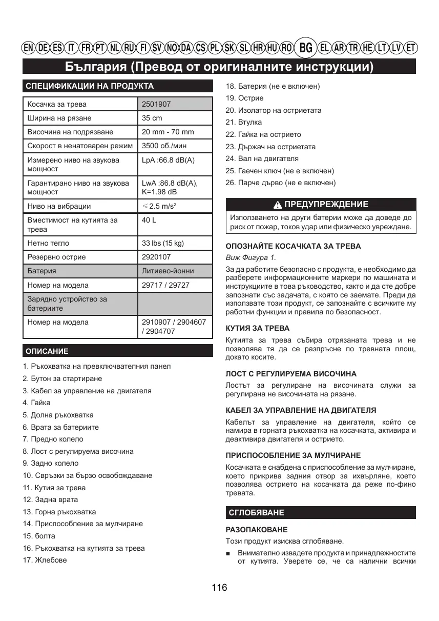 Téléchargez la notice de votre електрическа косачка au format PDF gratuitement ! Retrouvez votre notice G40LM35 - G40LM35K2 - G40LM41 - G40LM45K4 - GD40LM45 - GD40LM46SP - GREENWORKS et reprennez votre appareil électronique en main. Sur cette page sont publiés tous les documents nécessaires à l'utilisation de votre appareil G40LM35 - G40LM35K2 - G40LM41 - G40LM45K4 - GD40LM45 - GD40LM46SP de la marque GREENWORKS.