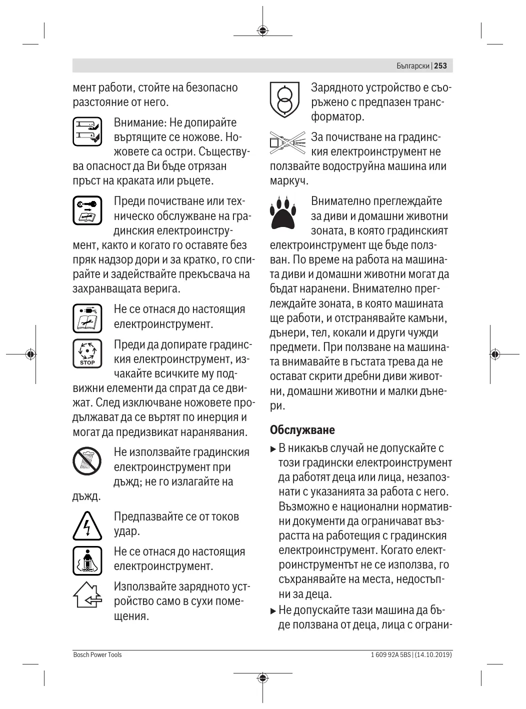 Указания за безопасна работа Внимание! Прочетете указанията по-долу внимателно. Запознайте се добре с обслужващите елементи и начинът на работа с продукта. Запазете ръководството за експлоатация за ползване по-късно. Пояснения на символите на Общо указание за опасност. Прочетете ръководството за експлоатация. Внимавайте намиращи се наблизо лица да не бъдат наранени от отхвърчащи парченца. Предупреждение: Когато градинският електроинстру- 1 609 92A 5BS | (14.10.2019) Bosch Power Tools Български | 253 мент работи, стойте на безопасно разстояние от него. Внимание: Не допирайте въртящите се ножове. Ножовете са остри. Съществува опасност да Ви бъде отрязан пръст на краката или ръцете. Преди почистване или техническо обслужване на градинския електроинструмент, както и когато го оставяте без пряк надзор дори и за кратко, го спирайте и задействайте прекъсвача на захранващата верига. Не се отнася до настоящия електроинструмент. Преди да допирате градинския електроинструмент, изчакайте всичките му подвижни елементи да спрат да се движат. След изключване ножовете продължават да се въртят по инерция и могат да предизвикат наранявания. Не използвайте градинския електроинструмент при дъжд; не го излагайте на Предпазвайте се от токов Не се отнася до настоящия електроинструмент. Използвайте зарядното устройство само в сухи помещения. Bosch Power Tools Зарядното устройство е съоръжено с предпазен трансформатор. За почистване на градинския електроинструмент не ползвайте водоструйна машина или Внимателно преглеждайте за диви и домашни животни зоната, в която градинският електроинструмент ще бъде ползван. По време на работа на машината диви и домашни животни могат да бъдат наранени. Внимателно преглеждайте зоната, в която машината ще работи, и отстранявайте камъни, дънери, тел, кокали и други чужди предмети. При ползване на машината внимавайте в гъстата трева да не остават скрити дребни диви животни, домашни животни и малки дънери. u В никакъв случай не допускайте с този градински електроинструмент да работят деца или лица, незапознати с указанията за работа с него. Възможно е национални нормативни документи да ограничават възрастта на работещия с градинския електроинструмент. Когато електроинструментът не се използва, го съхранявайте на места, недостъпни за деца. u Не допускайте тази машина да бъде ползвана от деца, лица с ограни1 609 92A 5BS | (14.10.2019) 254 | Български чени физически, сензорни или душевни способности или лица с недостатъчни познания и опит и/или лица, които не са запознати с тези указания. Възможно е национални нормативни документи да ограничават възрастта на работещия с градинския електроинструмент. u Деца трябва да бъдат под постоянен надзор, за да се предотврати опасността да играят с градинския електроинструмент. u В никакъв случай не използвайте градинския електроинструмент, ако в близост се намират деца или домашни животни. u Отговорен за травми на други лица или за материални щети е работещият с градинския електроинструмент. u Не работете с градинския електроинструмент, докато сте с джапанки или сандали. Носете винаги стабилни плътно затворени обувки и дълъг панталон. u Грижливо проверявайте предварително обработваната площ и отстранявайте камъни, пръчки, кокали и други чужди тела. u Винаги преди употреба проверявайте, дали ножовете, застопоряв