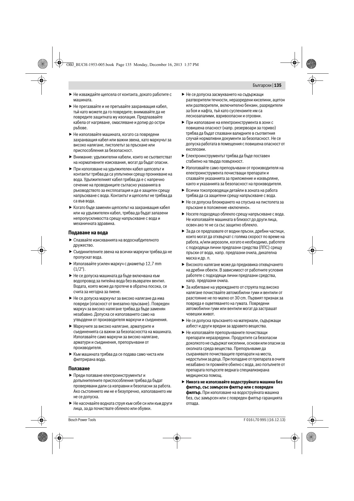 Sub rezerva modificărilor. F 016 L70 995 | (16.12.13) Bosch Power Tools OBJ_BUCH-1953-005.book Page 135 Monday, December 16, 2013 1:37 PM Български | 135 Не изваждайте щепсела от контакта, докато работите с Не прегазвайте и не прегъвайте захранващия кабел, тъй като можете да го повредите; внимавайте да не повредите защитната му изолация. Предпазвайте кабела от нагряване, омасляване и допир до остри Не използвайте машината, когато са повредени захранващия кабел или важни звена, като маркучът за високо налягане, пистолетът за пръскане или приспособления за безопасност. Внимание: удължителни кабели, които не съответстват на нормативните изисквания, могат да бъдат опасни. При използване на удължителен кабел щепселът и контактът трябва да са уплътнени срещу проникване на вода. Удължителният кабел трябва да е с напречно сечение на проводниците съгласно указанията в ръководството за експлоатация и да е защитен срещу напръскване с вода. Контактът и щепселът не трябва да са във вода. Когато бъде заменян щепселът на захранващия кабел или на удължителен кабел, трябва да бъдат запазени непропускливостта срещу напръскване с вода и механичната здравина. Подаване на вода Спазвайте изискванията на водоснабдителното Съединителните звена на всички маркучи трябва да не пропускат вода. Използвайте усилен маркуч с диаметър 12,7 mm (1/2"). Не се допуска машината да бъде включвана към водопровод за питейна вода без възвратен вентил. Водата, която може да протече в обратна посока, се счита за негодна за пиене. Не се допуска маркучът за високо налягане да има повреди (опасност от внезапно пръсване). Повреден маркуч за високо налягане трябва да бъде заменян незабавно. Допуска се използването само на утвърдени от производителя маркучи и съединения. Маркучите за високо налягане, арматурите и съединенията са важни за безопасността на машината. Използвайте само маркучи за високо налягане, арматури и съединения, препоръчвани от производителя. Към машината трябва да се подава само чиста или филтрирана вода.