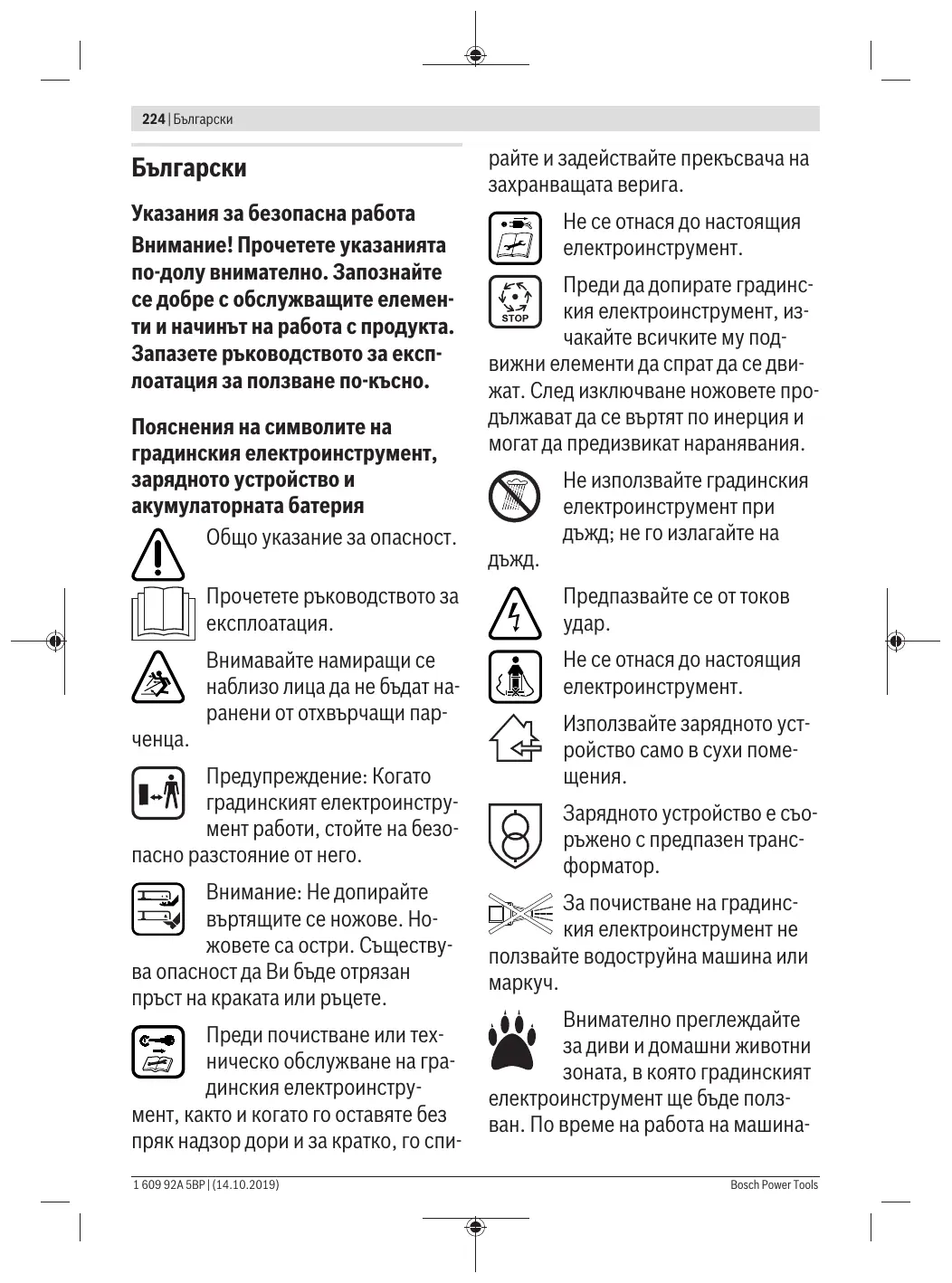 ченца. Предупреждение: Когато градинският електроинструмент работи, стойте на безопасно разстояние от него. Внимание: Не допирайте въртящите се ножове. Ножовете са остри. Съществува опасност да Ви бъде отрязан пръст на краката или ръцете. Преди почистване или техническо обслужване на градинския електроинструмент, както и когато го оставяте без пряк надзор дори и за кратко, го спи1 609 92A 5BP | (14.10.2019)