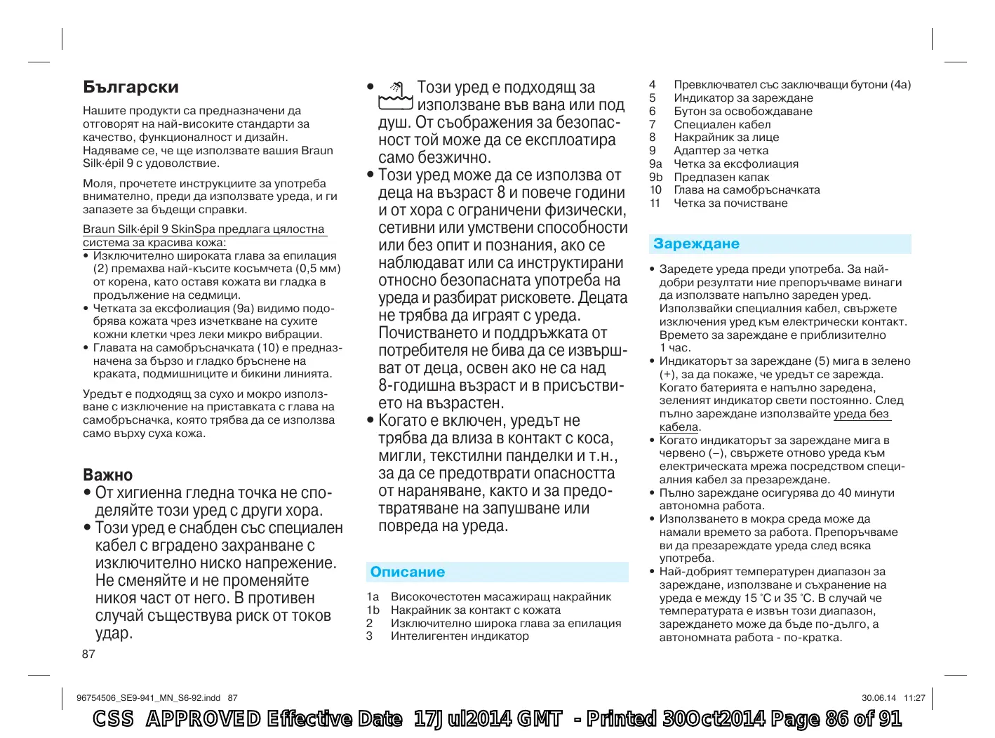 Български Нашите продукти са предназначени да отговорят на най-високите стандарти за качество, функционалност и дизайн. Надяваме се, че ще използвате вашия Braun Silk·épil 9 с удоволствие. Моля, прочетете инструкциите за употреба внимателно, преди да използвате уреда, и ги запазете за бъдещи справки. Braun Silk·épil 9 SkinSpa предлага цялостна система за красива кожа: • Изключително широката глава за епилация (2) премахва най-късите косъмчета (0,5 мм) от корена, като оставя кожата ви гладка в продължение на седмици. • Четката за ексфолиация (9а) видимо подобрява кожата чрез изчеткване на сухите кожни клетки чрез леки микро вибрации. • Главата на самобръсначката (10) е предназначена за бързо и гладко бръснене на краката, подмишниците и бикини линията. Уредът е подходящ за сухо и мокро използване с изключение на приставката с глава на самобръсначка, която трябва да се използва само върху суха кожа.