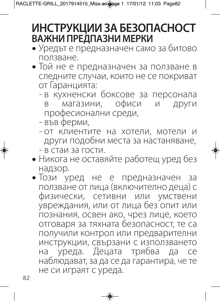• Уредът е предназначен само за битово ползване. • Той не е предназначен за ползване в следните случаи, които не се покриват от Гаранцията: - в кухненски боксове за персонала в магазини, офиси и други професионални среди, - във ферми, - от клиентите на хотели, мотели и други подобни места за настаняване, - в стаи за гости. • Никога не оставяйте работещ уред без надзор. • Този уред не е предназначен за ползване от лица (включително деца) с физически, сетивни или умствени увреждания, или от лица без опит или познания, освен ако, чрез лице, което отговаря за тяхната безопасност, те са получили контрол или предварителни инструкции, свързани с използването на уреда. Децата трябва да се наблюдават, за да се да гарантира, че те не си играят с уреда. 82