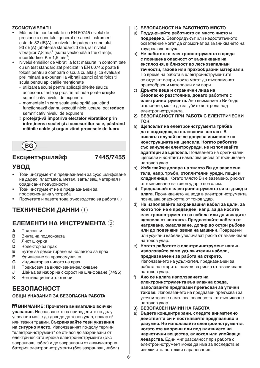 SEGURIDAD DE PERSONAS Esté atento y emplee la herramienta con prudencia. No utilice la herramienta eléctrica si estuviese cansado, ni bajo los efectos de alcohol, drogas o medicamentos. El no estar atento durante el uso de una herramienta eléctrica puede provocarle serias lesiones. Utilice un equipo de protección personal y en todo caso unas gafas de protección. El riesgo a lesionarse se reduce considerablemente si, dependiendo del tipo y la aplicación de la herramienta eléctrica empleada, se utiliza un equipo de protección adecuado como una mascarilla antipolvo, zapatos de seguridad con suela antideslizante, casco, o protectores auditivos. Evite una puesta en marcha fortuita. Asegurarse de que la herramienta eléctrica esté desconectada antes de conectarla a la toma de corriente y/o al montar el acumulador, al recogerla, y al transportarla. Si transporta la herramienta eléctrica sujetándola por el interruptor de conexión/desconexión, o si introduce el enchufe en la toma de corriente con la herramienta eléctrica conectada, ello puede dar lugar a un accidente. Retire las herramientas de ajuste o llaves fijas antes de conectar la herramienta eléctrica. Una herramienta o llave colocada en una pieza rotativa puede producir lesiones graves al accionar la herramienta eléctrica. Sea precavido. Trabaje sobre una base firme y mantenga el equilibrio en todo momento. Ello le permitirá controlar mejor la herramienta eléctrica en caso de presentarse una situación inesperada. Lleve puesta una vestimenta de trabajo adecuada. No utilice vestimenta amplia ni joyas. Mantenga su • El polvo del material, como por ejemplo la pintura que contiene plomo, algunas especies de madera, minerales y metal podrían ser dañinos (el contacto o inhalación del polvo podría producir reacciones alérgicas y/o transtornos respiratorios al operador u otras personas cerca); utilice una máscara contra el polvo y trabaje con un dispositivo de extracción de polvo cuando lo conecte • Ciertos tipos de polvo están catalogados como cancerígenos (por ejemplo el polvo de roble y de haya) especialmente junto con aditivos para el acondicionamiento de la madera; utilice una máscara contra el polvo y trabaje con un dispositivo de extracción de polvo cuando lo conecte • Siga la normativa nacional en cuanto a extracción de polvo, en función de los materiales que vayan a ser utilizados • Llevar guantes protectores, gafas de protección, vestimenta ceñida al cuerpo y protección adecuada para pelo largo • Asegure la pieza de trabajo (una pieza de trabajo fijada con unos dispositivos de sujeción o en un tornillo de banco, se mantiene sujeta de forma mucho más segura que con la mano) • Al lijar metal se generen chispas; no utilizar la caja de polvo y mantenga otras personas y materiales combustibles alejados de la zona de trabajo DURANTE EL USO • Mantenga siempre el cable lejos de las partes móviles de la herramienta; mantenga el cable detrás de usted, lejos de la herramienta • Evitar el contacto con el disco de lijado en marcha • En el caso de que se produjera un mal funcionamiento eléctrico o mecánico, apague inmediatamente la herramienta y desconecte el enchufe • Si llega a dañarse o cortarse el cable eléctrico durante el trabajo, no tocar el cable, sino extraer inmediatamente el enchufe de la red DESPUÉS DEL USO • Ponga atención al guardar su herramienta de que el motór está apagado y las partes móviles están parados -- monte la hoja de lijado VELCRO C de la forma ilustrada -- si es necesario, limpie primero el disco de apoyo !! las perforaciones de las hojas de lija deben corresponderse con las perforaciones de la lijadora !! la succión de polvo requiere que se usen hojas de lija perforadas !! cambie a tiempo las hojas de lija pasadas Aspiración de polvo 5 -- vacíe la caja de polvo D con regularidad para una aspiración optimal del polvo Para utilizar el aspirador -- retire la caja de polvo D pulsando el botón E hacia la izquierda y manteniéndolo en esa posición mientras tira la caja de polvo D hacia atrás -- monte el aspirador a la extensión F !! no utilice la caja de polvo/el aspirador al lijar metal Indicador del nivel de polvo 6 -- vacíe la caja de polvo D cuando el indicador G se vuelve ROJO -- el indicador G sólo funciona cuando la herramienta está encendida -- tenga presente que el funcionamiento del indicador de nivel de polvo no está garantizado cuando se lija con ajustes de velocidad bajos (7455) Interruptor On/Off -- ponga en marcha/pare su herramienta apretando el interruptor H 2 hacia adelante/atras !! antes de trabajar sobre una pieza, se debe poner en marcha su herramienta !! tenga cuidado con la reacción súbita de la herramienta, al conectarla !! antes de desactivar la herramienta, debe retirarla de la pieza de trabajo Control de velocidad 7 (7455) Para resultados optimos en diferentes materiales -- con la rueda J 2 se puede lograr la velocidad de lijado deseada -- ajustar siempre la velocidad según el grano de lija -- antes de empezar el trabajo, compruebe la velocidad y grano favorable con los materiales restante desperdiciados Sujección y manejo de la herramienta 8 !! durante el trabajo, sujete siempre la herramienta por la(s) zona(s) de empuñadura de color gris -- guie su herramienta paralelamente a la superficie de trabajo y muevala en circulos o en forma de cruz -- no ejerza demasiada presión en la herramienta; deje que la herramienta haga su trabajo -- no incline su herramienta para evitar marcas de lijado no deseadas -- mantenga las ranuras de ventilación K 2 descubiertas Lijado -- la capacidad de arranque de material viene determinada por la hoja de lijado seleccionada, la velocidad de lijado preseleccionada y por la presión