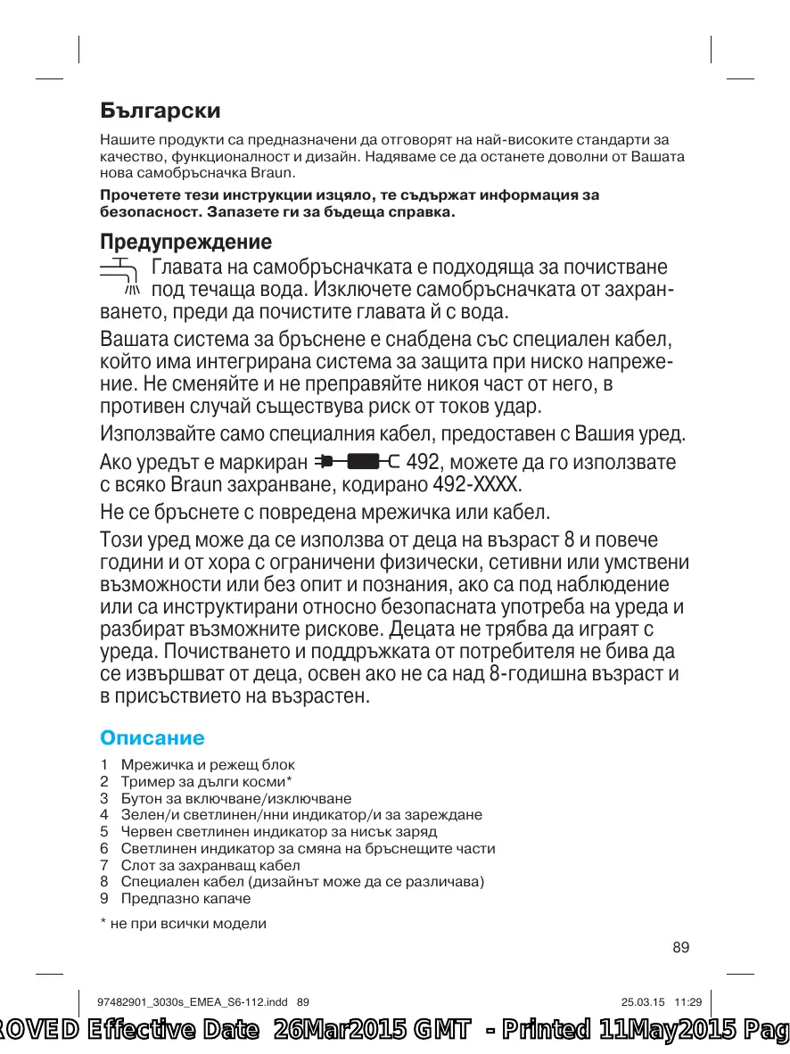 Téléchargez la notice de votre електрическа самобръсначка au format PDF gratuitement ! Retrouvez votre notice SERIE 5 5040S WET&DRY - BRAUN et reprennez votre appareil électronique en main. Sur cette page sont publiés tous les documents nécessaires à l'utilisation de votre appareil SERIE 5 5040S WET&DRY de la marque BRAUN.