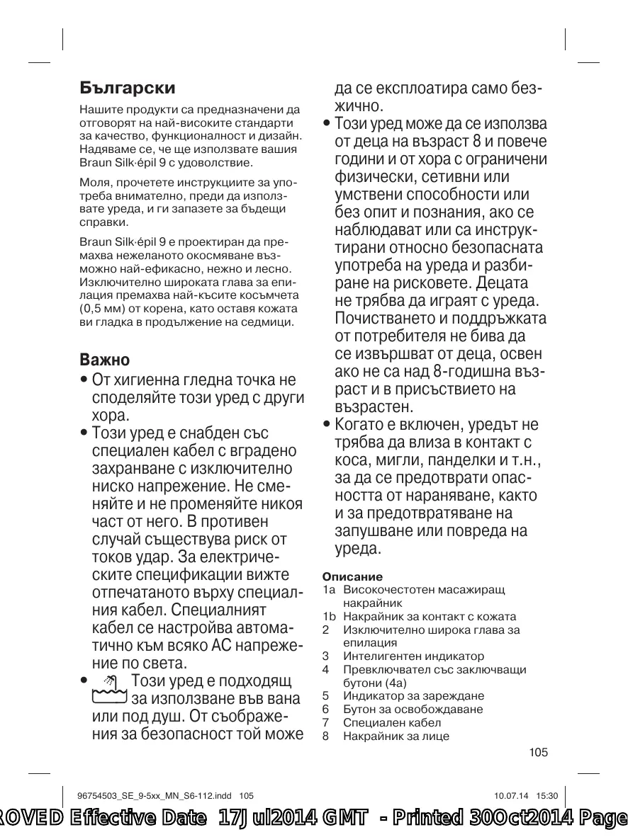 да се експлоатира само безжично. Нашите продукти са предназначени да отговорят на най-високите стандарти • Този уред може да се използва за качество, функционалност и дизайн. от деца на възраст 8 и повече Надяваме се, че ще използвате вашия години и от хора с ограничени Braun Silk·épil 9 с удоволствие. физически, сетивни или Моля, прочетете инструкциите за употреба внимателно, преди да използумствени способности или вате уреда, и ги запазете за бъдещи без опит и познания, ако се справки. наблюдават или са инструкBraun Silk·épil 9 е проектиран да претирани относно безопасната махва нежеланото окосмяване възупотреба на уреда и разбиможно най-ефикасно, нежно и лесно. Изключително широката глава за епиране на рисковете. Децата лация премахва най-късите косъмчета не трябва да играят с уреда. (0,5 мм) от корена, като оставя кожата Почистването и поддръжката ви гладка в продължение на седмици. от потребителя не бива да се извършват от деца, освен Важно ако не са над 8-годишна въз• От хигиенна гледна точка не раст и в присъствието на споделяйте този уред с други възрастен. хора. • Когато е включен, уредът не • Този уред е снабден със трябва да влиза в контакт с специален кабел с вградено коса, мигли, панделки и т.н., захранване с изключително за да се предотврати опасниско напрежение. Не смеността от нараняване, както няйте и не променяйте никоя и за предотвратяване на част от него. В противен запушване или повреда на случай съществува риск от уреда. токов удар. За електрическите спецификации вижте Описание отпечатаното върху специал- 1a Високочестотен масажиращ накрайник ния кабел. Специалният 1b Накрайник за контакт с кожата кабел се настройва автома2 Изключително широка глава за епилация тично към всяко AC напреже3 Интелигентен индикатор ние по света. 4 Превключвател със заключващи • Този уред е подходящ бутони (4a) за използване във вана 5 Индикатор за зареждане 6 Бутон за освобождаване или под душ. От съображе7 Специален кабел ния за безопасност той може 8 Накрайник за лице Български