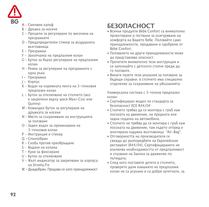 A – Сменяем калъф B – Дръжка за носене C – Процепи за регулиране по височина на презрамките D – Предупредителен стикер за въздушната възглавница E - Презрамки F – Закопчалка на предпазния колан G – Бутон за бързо регулиране на предпазния H – Ремък за регулиране на презрамките с I - Презрамки J - Корпус K – Водач на коремната лента на 3-точковия предпазен колан L - Бутон за отключване на столчето (ако е закрепено върху шаси Maxi-Cosi или Quinny) M – Команден бутон за регулиране на дръжката за носене N – Място за съхраняване на инструкцията за ползване O – Заден водач за преминаване на 3-точковия колан P – Инструкция и стикер Q - Слънчобран R – Скоба против преобръщане S – Водачи на колана T – Куки за фиксиране U – Бутон за отключване V – Жълт индикатор за закрепване за корпуса на Streety.Fix W - Дъждобран. Продава се като принадлежност БЕЗОПАСНОСТ