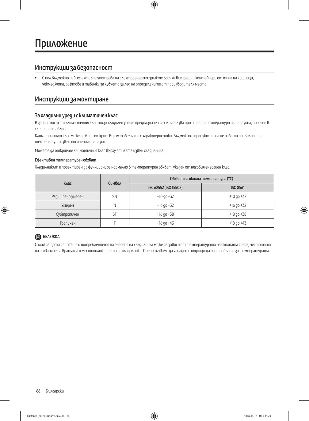 BRB6000_DA68-04283E-00.indb 66 2020-12-16 9:15:49 Инструкции, свързани с температурата Препоръчителна температура Оптималната настройка на температурата за съхранение на храни е: