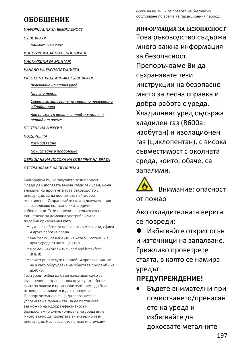 Nous vous suggérons de conserver ces instructions dans un endroit sûr pour une référence ultérieure aisée et une bonne utilisation de l’appareil. Ce réfrigérateur contient un gaz réfrigérant (R600a : isobutane) et un gaz isolant (cyclopentane), qui présentent une compatibilité élevée avec l’environnement mais des propriétés inflammables. Attention : risque d’incendie En cas de dommages du circuit de réfrigérant :  Éviter des flammes ouvertes et des sources d’inflammation. Bien aérer la pièce dans laquelle se trouve l’appareil. AVERTISSEMENT !  Il convient de prêter une attention particulière lors du nettoyage/du transport de l’appareil pour éviter de 26