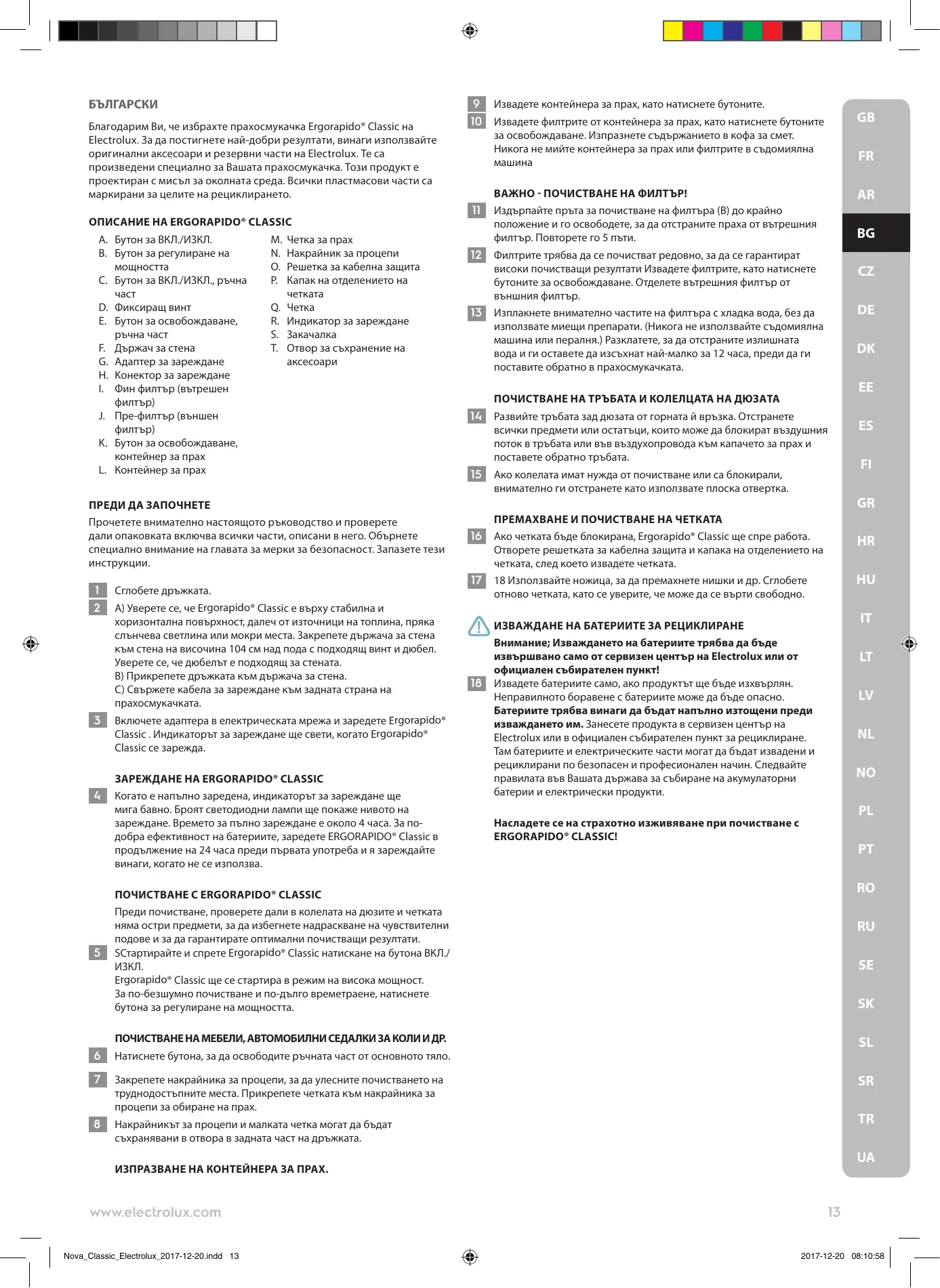 БЪЛГАРСКИ Благодарим Ви, че избрахте прахосмукачка Ergorapido® Classic на Electrolux. За да постигнете най-добри резултати, винаги използвайте оригинални аксесоари и резервни части на Electrolux. Те са произведени специално за Вашата прахосмукачка. Този продукт е проектиран с мисъл за околната среда. Всички пластмасови части са маркирани за целите на рециклирането. ОПИСАНИЕ НА ERGORAPIDO® CLASSIC A. Бутон за ВКЛ./ИЗКЛ. B. Бутон за регулиране на мощността C. Бутон за ВКЛ./ИЗКЛ., ръчна част D. Фиксиращ винт E. Бутон за освобождаване, ръчна част F. Държач за стена G. Адаптер за зареждане H. Kонектор за зареждане I. Фин филтър (вътрешен филтър) J. Пре-филтър (външен филтър) K. Бутон за освобождаване, контейнер за прах L. Контейнер за прах