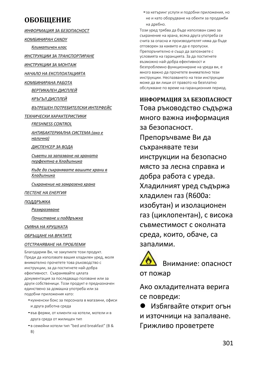 ИНФОРМАЦИЯ ЗА БЕЗОПАСНОСТ КОМБИНИРАН CANDY Климатичен клас ИНСТРУКЦИИ ЗА ТРАНСПОРТИРАНЕ ИНСТРУКЦИИ ЗА МОНТАЖ НАЧАЛО НА ЕКСПЛОАТАЦИЯТА КОМБИНИРАНА РАБОТА ВЕРТИКАЛЕН ДИСПЛЕЙ - за кетъринг услуги и подобни приложения, но не и като оборудване на обекти за продажби Този уред трябва да бъде използван само за съхранение на храна, всяка друга употреба се счита за опасна и производителят няма да бъде отговорен за каквито и да е пропуски. Препоръчително е също да запознаете с условията на гаранцията. За да постигнете възможно най-добра ефективност и безпроблемно функциониране на уреда ви, е много важно да прочетете внимателно тези инструкции. Неспазването на тези инструкции може да ви лиши от правото на безплатно обслужване по време на гаранционния период. КРЪГЪЛ ДИСПЛЕЙ ИНФОРМАЦИЯ ЗА БЕЗОПАСНОСТ ВЪТРЕШЕН ПОТРЕБИТЕЛСКИ ИНТЕРФЕЙС Това ръководство съдържа много важна информация за безопасност. Препоръчваме Ви да съхранявате тези инструкции на безопасно място за лесна справка и добра работа с уреда. Хладилният уред съдържа хладилен газ (R600a: изобутан) и изолационен газ (циклопентан), с висока съвместимост с околната среда, които, обаче, са