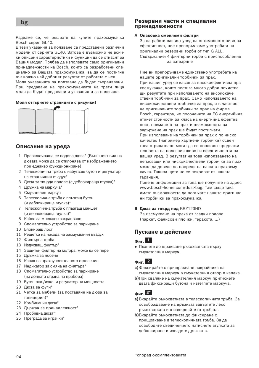 Радваме се, че решихте да купите прахосмукачка Bosch серия GL40. В тези указания за ползване са представени различни модели от серията GL40. Затова е възможно не всички описани характеристики и функции да се отнасят за Вашия модел. Трябва да използвате само оригинални принадлежности на Bosch, които са разработени специално за Вашата прахосмукачка, за да се постигне възможно най-добрият резултат от работата с нея. Моля указанията за ползване да бъдат съхранявани. При предаване на прахосмукачката на трети лица моля да бъдат предавани и указанията за ползване. Моля отгърнете страниците с рисунки! Описание на уреда 1 Превключваща се подова дюза* (Външният вид на дюзата може да се отклонява от изображението при еднакво функциониране) 2 Телескопична тръба с избутващ бутон и регулатор на страничния въздух* 3 Дюза за твърди подове (с деблокираща втулка)* 4 Дръжка на маркуча* 5 Смукателен маркуч 6 Телескопична тръба с плъзгащ бутон (и деблокираща втулка)* 7 Телескопична тръба с плъзгащ маншет (и деблокираща втулка)* 8 Кабел за мрежово захранване 9 Спомагателно устройство за паркиране 10 Блокиращ лост 11 Решетка на изхода на засмуквания въздух 12 Филтърна торба 13 Издухващ филтър* 14 Защитен филтър на мотора, може да се пере 15 Дръжка за носене 16 Капак на прахоуловителното отделение 17 Индикатор за смяна на филтъра* 18 Спомагателно устройство за паркиране (на долната страна на прибора) 19 Бутон вкл./изкл. и регулатор на мощността 20 Дюза за фуги* 21 Четка за мебели (за поставяне на дюза за тапицерия)* 22 Комбинация дюза* 23 Държач за принадлежност* 24 Пробивна дюза* 25 Преграда за играчки*