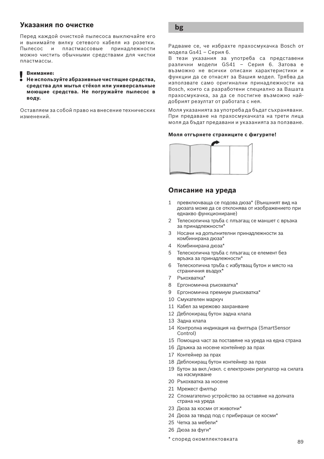 bg Радваме се, че избрахте прахосмукачка Bosch от модела Gs41 – Серия 6. В тези указания за употреба са представени различни модели GS41 – Серия 6. Затова е възможно не всички описани характеристики и функции да се отнасят за Вашия модел. Трябва да използвате само оригинални принадлежности на Bosch, които са разработени специално за Вашата прахосмукачка, за да се постигне възможно найдобрият резултат от работата с нея. Моля указанията за употреба да бъдат съхранявани. При предаване на прахосмукачката на трети лица моля да бъдат предавани и указанията за ползване. Моля отгърнете страниците с фигурите!