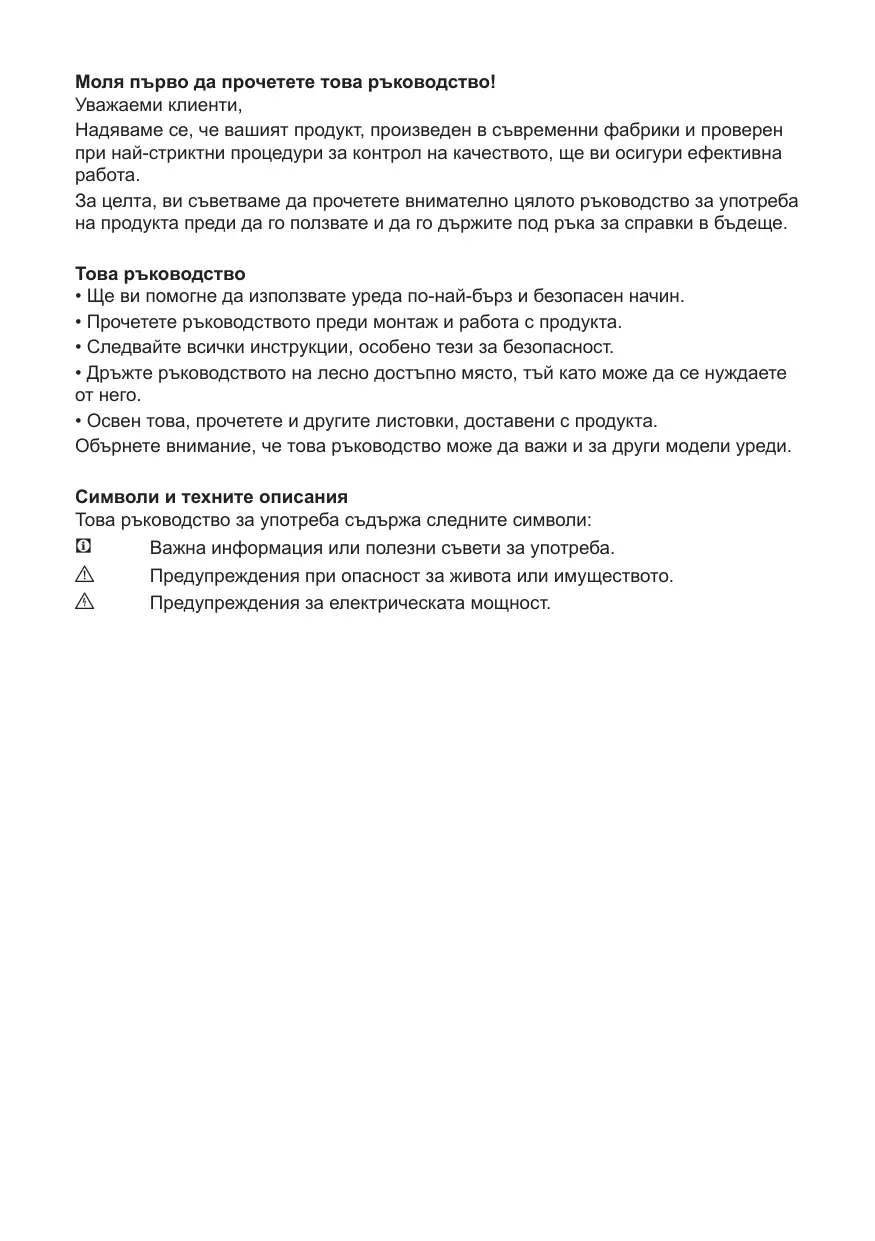 - Освен това, прочетете и другите листовки, доставени с продукта. Обърнете внимание, че това ръководство може да важи и за други модели уреди. Символи и техните описания Това ръководство за употреба съдържа следните символи: Важна информация или полезни съвети за употреба. Предупреждения при опасност за живота или имуществото. Предупреждения за електрическата мощност.