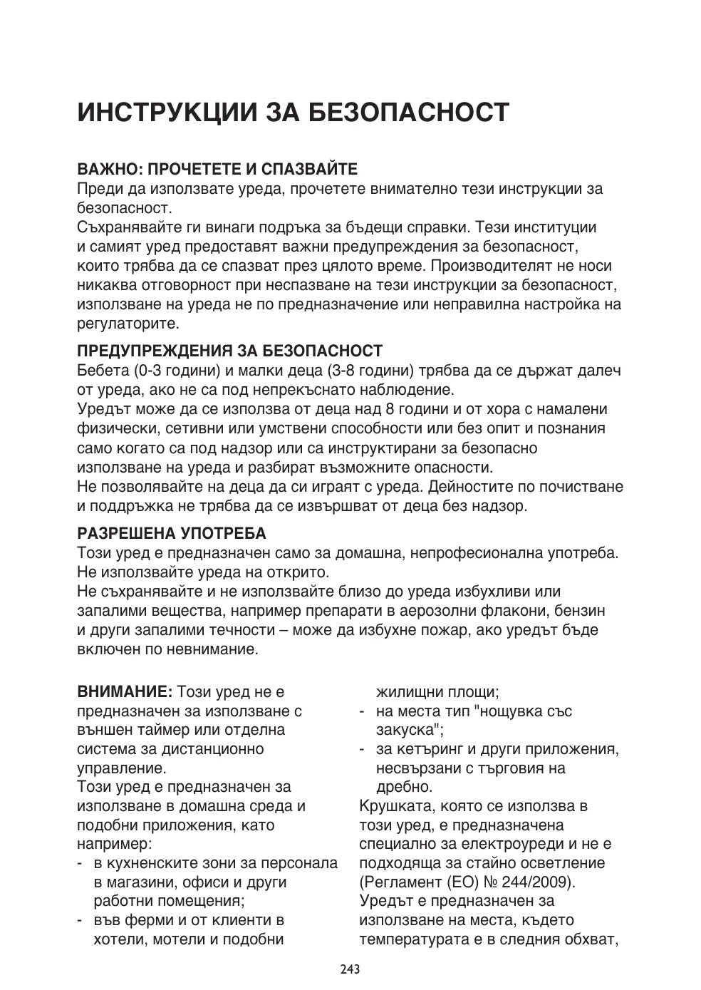 Les conserver à portée de main pour toute référence future. Les mises en garde contenues dans ces consignes de sécurité et sur l'appareil doivent toujours être respectées. Le fabricant décline toute responsabilité en cas de non-respect de ces consignes de sécurité, d'utilisation incorrecte de l'appareil ou de mauvais réglage des commandes. MISES EN GARDE Tenez les nourrissons (0-3 ans) et les jeunes enfants (3-8 ans) éloignés de l'appareil sauf en les tenant sous constante surveillance. Les enfants de 8 ans et plus ainsi que les personnes présentant des capacités physiques, sensorielles ou mentales réduites, ou ne possédant ni l'expérience ni les connaissances requises, peuvent utiliser cet appareil sous la surveillance ou les instructions d'une personne responsable leur ayant expliqué l'utilisation de l'appareil en toute sécurité, ainsi que les dangers potentiels. Ne laissez pas les enfants jouer avec l'appareil. Ne laissez pas les enfants nettoyer et procéder à l'entretien de l'appareil sans surveillance. EMPLOI AUTORISÉ Cet appareil est prévu pour un usage domestique et non professionnel. N'utilisez jamais l'appareil à l'extérieur. Ne stockez pas de substances explosives ou inflammables, comme des aérosols, et ne placez pas ou n'utiliser d'essence ou d'autres produits inflammables à proximité de l'appareil : un incendie pourrait se déclarer en cas de mise sous tension de l'appareil. ATTENTION ! L'appareil n'est pas prévu pour une utilisation au moyen d'une minuterie extérieure ou d'un système contrôlé à distance. Cet appareil a été conçu à des fins domestiques et pour des applications similaires, telles que : - cuisines pour le personnel de boutiques, bureaux et autres lieux de travail ; - gîtes et clients d'hôtels, de motels ou d'autres types d'hébergements ;