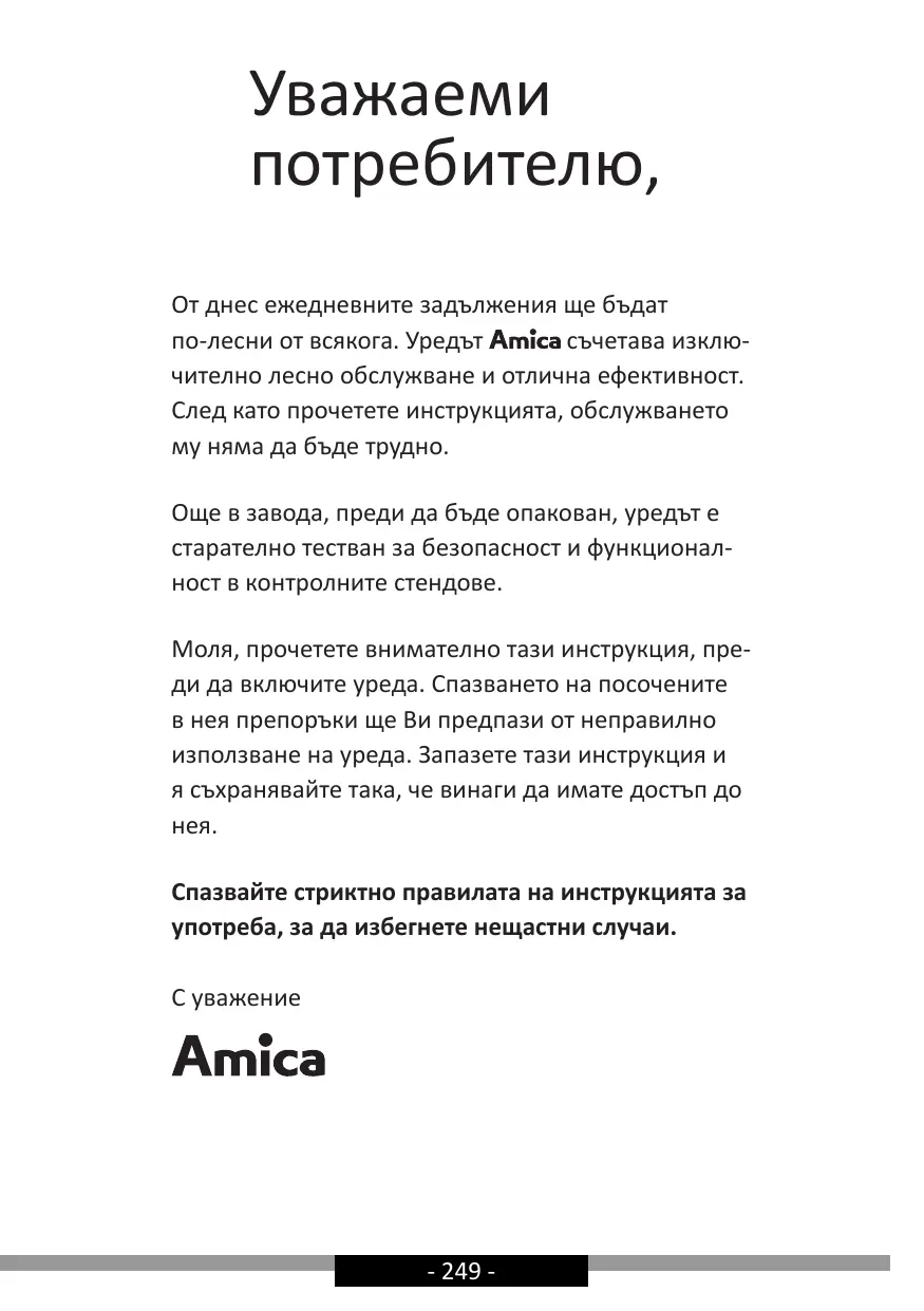 Уважаеми потребителю, От днес ежедневните задължения ще бъдат по-лесни от всякога. Уредът съчетава изключително лесно обслужване и отлична ефективност. След като прочетете инструкцията, обслужването му няма да бъде трудно. Още в завода, преди да бъде опакован, уредът е старателно тестван за безопасност и функционалност в контролните стендове. Моля, прочетете внимателно тази инструкция, преди да включите уреда. Спазването на посочените в нея препоръки ще Ви предпази от неправилно използване на уреда. Запазете тази инструкция и я съхранявайте така, че винаги да имате достъп до нея. Спазвайте стриктно правилата на инструкцията за употреба, за да избегнете нещастни случаи. С уважение