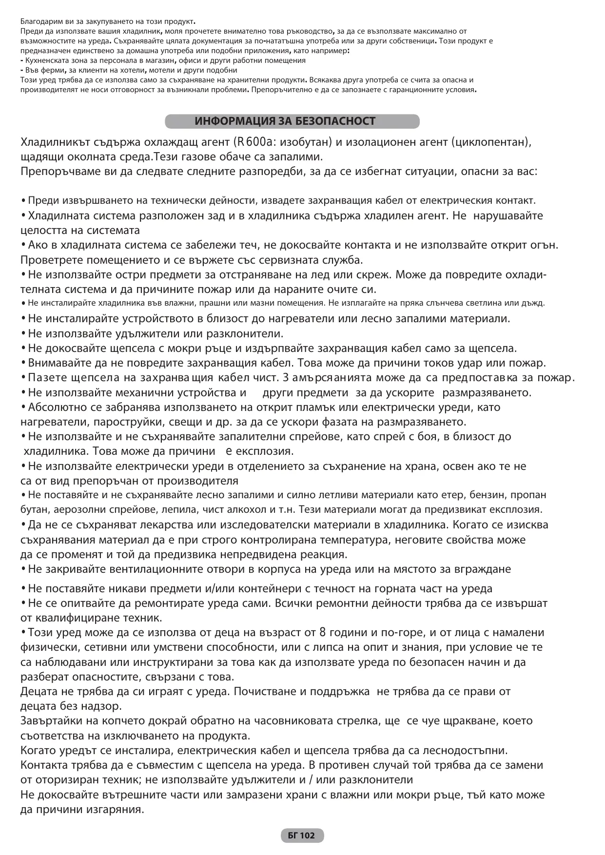 • Да не се съхраняват лекарства или изследователски материали в хладилника. Когато се изисква съхранявания материал да е при строго контролирана температура, неговите свойства може да се променят и той да предизвика непредвидена реакция. • Не закривайте вентилационните отвори в корпуса на уреда или на мястото за вграждане • Не поставяйте никави предмети и/или контейнери с течност на горната част на уреда • Не се опитвайте да ремонтирате уреда сами. Всички ремонтни дейности трябва да се извършат от квалифициране техник. • Този уред може да се използва от деца на възраст от 8 години и по-горе, и от лица с намалени физически, сетивни или умствени способности, или с липса на опит и знания, при условие че те са наблюдавани или инструктирани за това как да използвате уреда по безопасен начин и да разберат опасностите, свързани с това. Децата не трябва да си играят с уреда. Почистване и поддръжка не трябва да се прави от децата без надзор. Завъртайки на копчето докрай обратно на часовниковата стрелка, ще се чуе щракване, което съответства на изключването на продукта. Когато уредът се инсталира, електрическия кабел и щепсела трябва да са леснодостъпни. Контакта трябва да е съвместим с щепсела на уреда. В противен случай той трябва да се замени от оторизиран техник; не използвайте удължители и / или разклонители Не докосвайте вътрешните части или замразени храни с влажни или мокри ръце, тъй като може да причини изгаряния. БГ 102