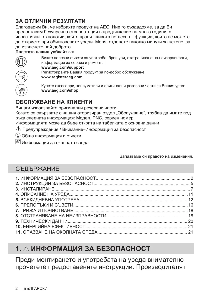 Obtenir des conseils d’utilisation, des brochures, un dépanneur, des informations sur le service et les réparations : www.aeg.com/support Enregistrer votre produit pour un meilleur service : www.registeraeg.com Acheter des accessoires, consommables et pièces de rechange d’origine pour votre appareil : www.aeg.com/shop
