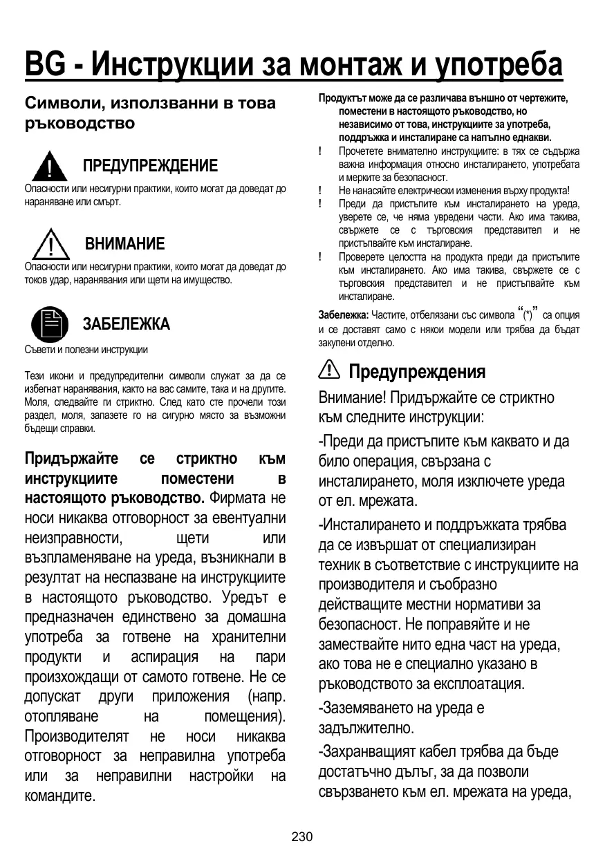 Придържайте се стриктно към инструкциите поместени в настоящото ръководство. Фирмата не носи никаква отговорност за евентуални неизправности, щети или възпламеняване на уреда, възникнали в резултат на неспазване на инструкциите в настоящото ръководство. Уредът е предназначен единствено за домашна употреба за готвене на хранителни продукти и аспирация на пари произхождащи от самото готвене. Не се допускат други приложения (напр. отопляване на помещения). Производителят не носи никаква отговорност за неправилна употреба или за неправилни настройки на командите. 230