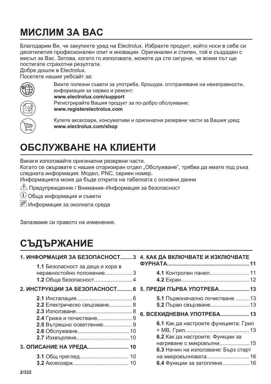 МИСЛИМ ЗА ВАС Благодарим Ви, че закупихте уред на Electrolux. Избрахте продукт, който носи в себе си десетилетия професионален опит и иновации. Оригинален и стилен, той е създаден с мисъл за Вас. Затова, когато го използвате, можете да сте сигурни, че всеки път ще постигате страхотни резултати. Добре дошли в Electrolux. Посетете нашия уебсайт за: Вижте полезни съвети за употреба, брошури, отстраняване на неизправности, информация за сервиз и ремонт: www.electrolux.com/support Регистрирайте Вашия продукт за по-добро обслужване: www.registerelectrolux.com Купете аксесоари, консумативи и оригинални резервни части за Вашия уред: www.electrolux.com/shop ОБСЛУЖВАНЕ НА КЛИЕНТИ Винаги използвайте оригинални резервни части. Когато се свързвате с нашия оторизиран отдел „Обслужване“, трябва да имате под ръка следната информация: Модел, PNC, сериен номер. Информацията може да бъде открита на табелката с основни данни Предупреждение / Внимание–Информация за безопасност Обща информация и съвети Информация за околната среда Запазваме си правото на изменения.