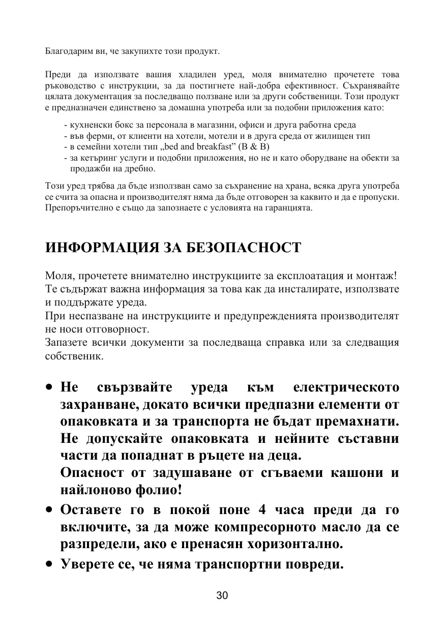 Благодарим ви, че закупихте този продукт. Преди да използвате вашия хладилен уред, моля внимателно прочетете това ръководство с инструкции, за да постигнете най-добра ефективност. Съхранявайте цялата документация за последващо ползване или за други собственици. Този продукт е предназначен единствено за домашна употреба или за подобни приложения като: - кухненски бокс за персонала в магазини, офиси и друга работна среда - във ферми, от клиенти на хотели, мотели и в друга среда от жилищен тип - в семейни хотели тип „bed and breakfast” (B & B) - за кетъринг услуги и подобни приложения, но не и като оборудване на обекти за продажби на дребно. Този уред трябва да бъде използван само за съхранение на храна, всяка друга употреба се счита за опасна и производителят няма да бъде отговорен за каквито и да е пропуски. Препоръчително е също да запознаете с условията на гаранцията.