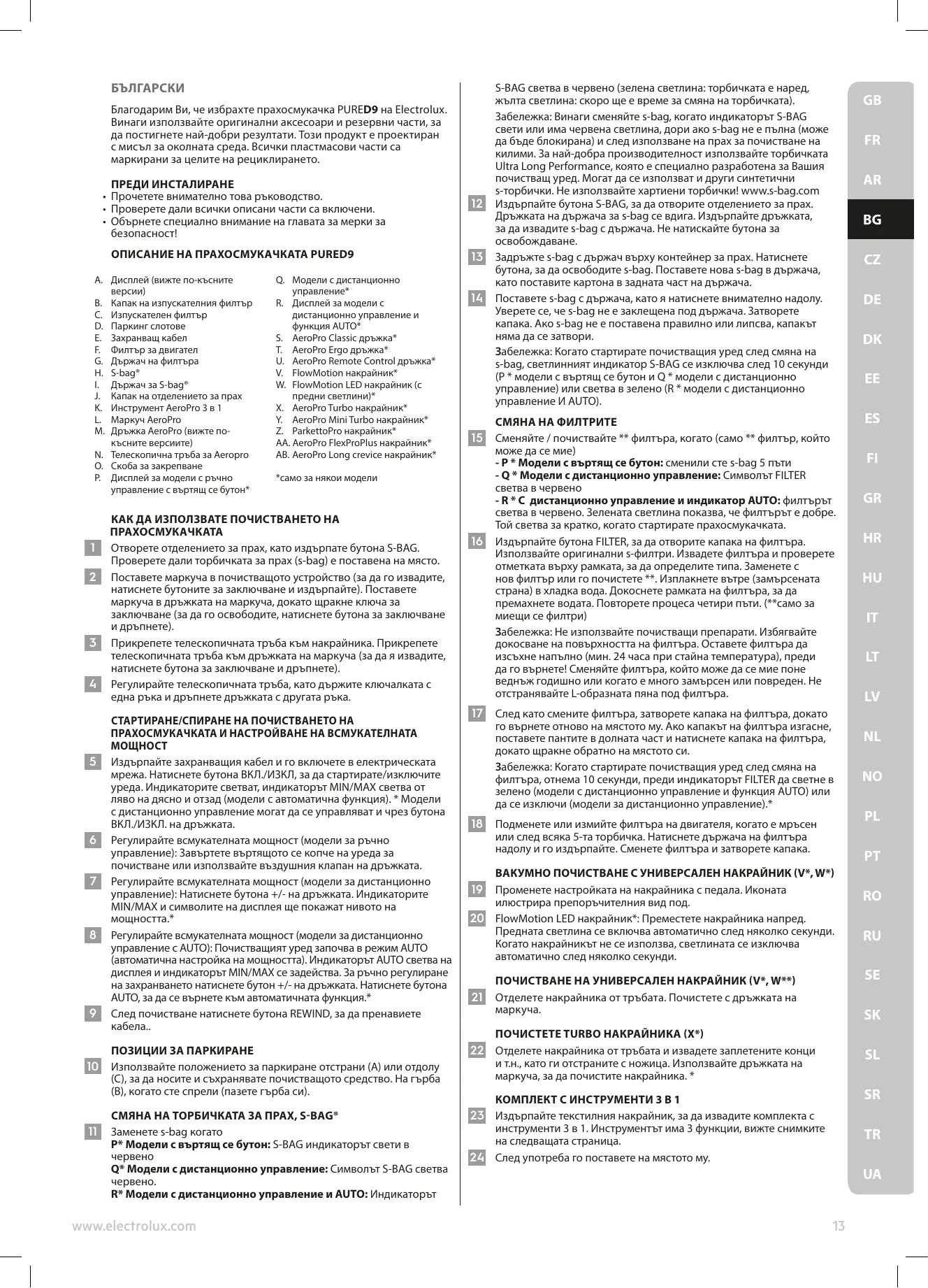 Y. AeroPro Mini Turbo накрайник* Z. ParkettoPro накрайник* АА. AeroPro FlexProPlus накрайник* AB. AeroPro Long crevice накрайник* КАК ДА ИЗПОЛЗВАТЕ ПОЧИСТВАНЕТО НА ПРАХОСМУКАЧКАТА Отворете отделението за прах, като издърпате бутона S-BAG. Проверете дали торбичката за прах (s-bag) е поставена на място. Поставете маркуча в почистващото устройство (за да го извадите, натиснете бутоните за заключване и издърпайте). Поставете маркуча в дръжката на маркуча, докато щракне ключа за заключване (за да го освободите, натиснете бутона за заключване и дръпнете). Прикрепете телескопичната тръба към накрайника. Прикрепете телескопичната тръба към дръжката на маркуча (за да я извадите, натиснете бутона за заключване и дръпнете). Регулирайте телескопичната тръба, като държите ключалката с една ръка и дръпнете дръжката с другата ръка. СТАРТИРАНЕ/СПИРАНЕ НА ПОЧИСТВАНЕТО НА ПРАХОСМУКАЧКАТА И НАСТРОЙВАНЕ НА ВСМУКАТЕЛНАТА Издърпайте захранващия кабел и го включете в електрическата мрежа. Натиснете бутона ВКЛ./ИЗКЛ, за да стартирате/изключите уреда. Индикаторите светват, индикаторът MIN/MAX светва от ляво на дясно и отзад (модели с автоматична функция). * Модели с дистанционно управление могат да се управляват и чрез бутона ВКЛ./ИЗКЛ. на дръжката. Регулирайте всмукателната мощност (модели за ръчно управление): Завъртете въртящото се копче на уреда за почистване или използвайте въздушния клапан на дръжката. Регулирайте всмукателната мощност (модели за дистанционно управление): Натиснете бутона +/- на дръжката. Индикаторите MIN/MAX и символите на дисплея ще покажат нивото на мощността.* Регулирайте всмукателната мощност (модели за дистанционно управление с AUTO): Почистващият уред започва в режим AUTO (автоматична настройка на мощността). Индикаторът AUTO светва на дисплея и индикаторът MIN/MAX се задейства. За ръчно регулиране на захранването натиснете бутон +/- на дръжката. Натиснете бутона AUTO, за да се върнете към автоматичната функция.* След почистване натиснете бутона REWIND, за да пренавиете ПОЗИЦИИ ЗА ПАРКИРАНЕ (C), за да носите и съхранявате почистващото средство. На гърба (В), когато сте спрели (пазете гърба си). СМЯНА НА ТОРБИЧКАТА ЗА ПРАХ, S-BAG® Заменете s-bag когато P* Модели с въртящ се бутон: S-BAG индикаторът свети в Q* Модели с дистанционно управление: Символът S-BAG светва R* Модели с дистанционно управление и AUTO: Индикаторът www.electrolux.com