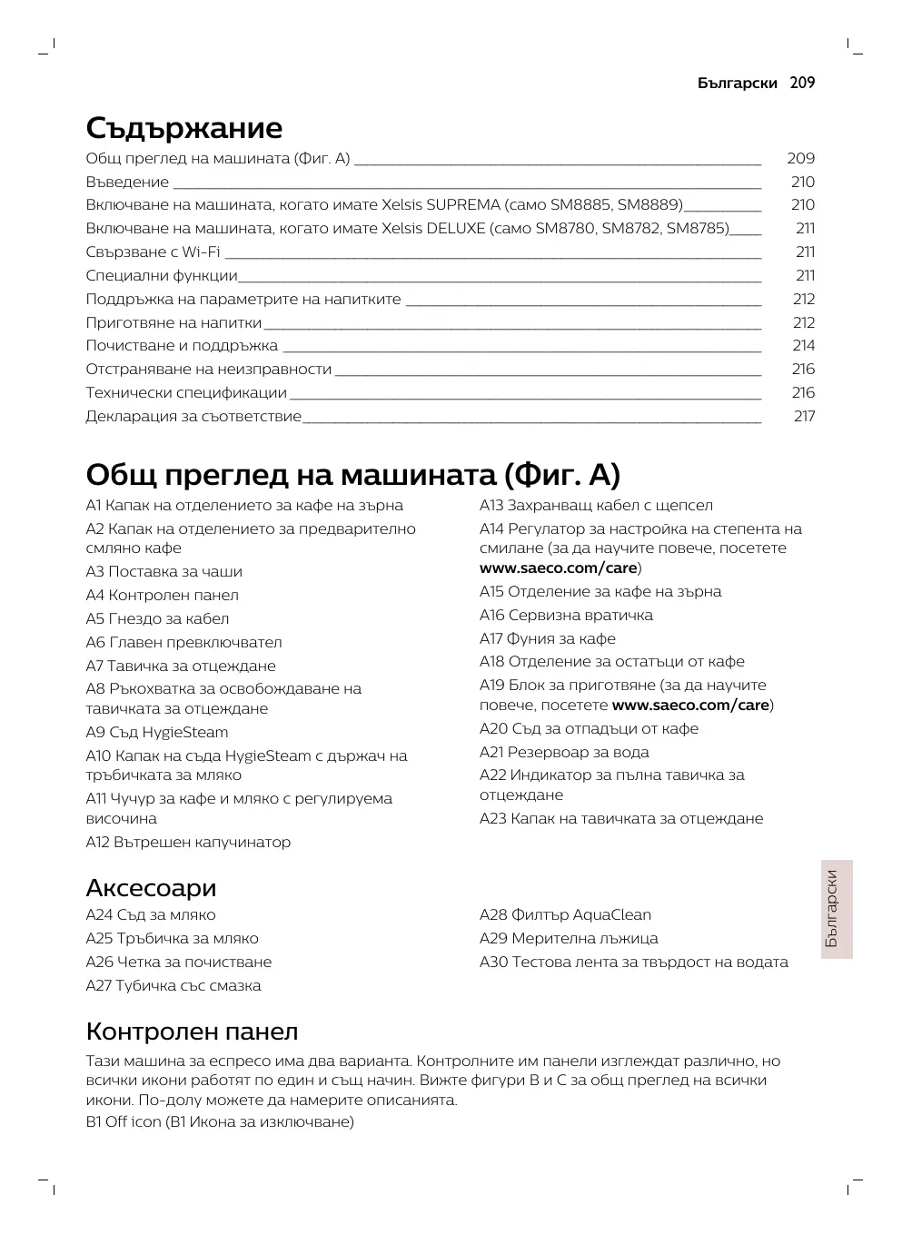 Въведение Поздравяваме ви за покупката на напълно автоматична кафемашина Saeco! Това кратко ръководство за потребителя ще ви помогне да започнете бързо работа с новата ви кафе машина. За да се възползвате напълно от онлайн поддръжката, която Saeco предлага, можете да използвате контролния панел, за да регистрирате машината си чрез вградената Wi-Fi връзка, или отидете на www.saeco.com/MyCoffeeMachine и регистрирайте продукта си там. Там можете да намерите и често задавани въпроси, както и разширената версия на ръководството за потребителя. Преди да използвате машината за първи път, прочетете внимателно отделната брошура с информация за безопасност и я запазете за справка в бъдеще. Вашата напълно автоматична кафе машина Saeco ви позволява да се свържете с вашата Wi-Fi мрежа, за да подобрите вашето кафе изживяване. Като свържете машината към вашата Wi-Fi мрежа, ще можете да: - получавате персонализирани препоръки, базирани на машинно обучение - се наслаждавате на редовни актуализации на софтуера, за да подобрите вашето потребителско изживяване - използвате функцията за пазаруване, ако е налична във вашата държава - можете да свържете вашата машина с акаунт в Amazon за снабдяване с аксесоари, ако тази опция е налична във вашата държава - се свържете с домашното си устройство Alexa, за да използвате гласов контрол, ако това е налично за вашата държава Забележка: Тази машина е тествана с кафе. Въпреки че е почистена внимателно, в нея може да има остатъци от кафе. Гарантираме обаче, че машината е абсолютно нова.