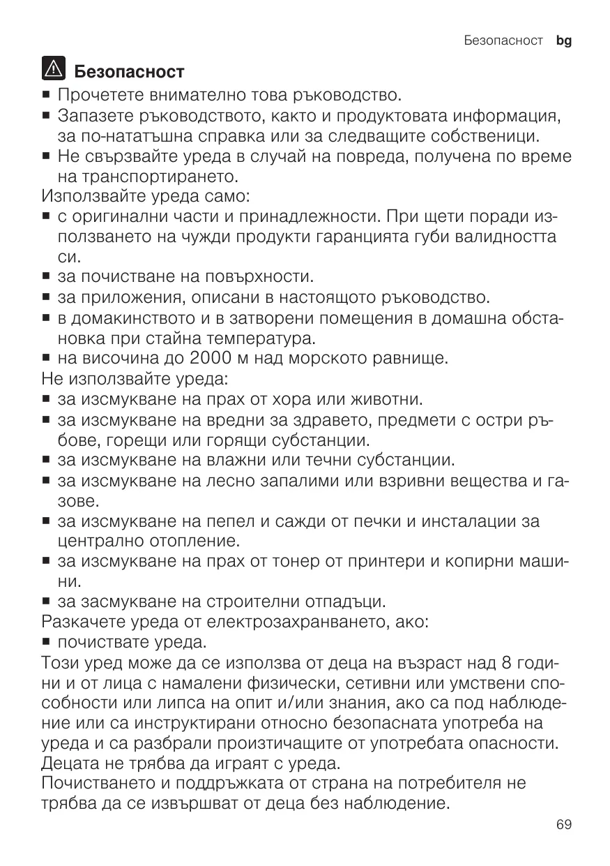 ¡ Read this instruction manual carefully. ¡ Keep the instruction manual and the product information safe for future reference or for the next owner. ¡ avec des pièces et accessoires d’origine. En cas de dommages dus à l’utilisation de produits tiers, le droit à la garantie expire. ¡ pour nettoyer les surfaces. ¡ pour les utilisations décrites dans cette notice. ¡ pour un usage domestique privé et dans les pièces fermées d’un domicile, à la température ambiante. ¡ jusqu'à une altitude maximale de 2000 m au-dessus du niveau de la mer. N’utilisez pas l’appareil : ¡ pour l’aspiration de personnes et d’animaux. ¡ pour l’aspiration de substances nocives pour la santé, aux arêtes vives, chaudes ou brûlantes. ¡ pour l’aspiration de substances humides ou liquides. ¡ pour l’aspiration de substances et gaz légèrement inflammables ou explosibles. ¡ pour l’aspiration de cendres, de la suie de four et d’installations de chauffage central. ¡ pour l’aspiration de poussières de toner des imprimantes et copieurs. ¡ pour l’aspiration de débris de construction. Débranchez l’appareil du secteur lorsque : ¡ vous nettoyez l’appareil. Les enfants de 8 ans et plus, les personnes souffrant d’un handicap physique, sensoriel ou mental ou ne détenant pas l’expérience et/ou les connaissances nécessaires pourront utiliser cet appareil à condition de le faire sous surveillance, ou que son utilisation sûre leur ait été enseignée et qu’ils aient compris les dangers qui en émanent. Les enfants ne sont pas autorisés à jouer avec l'appareil. 17