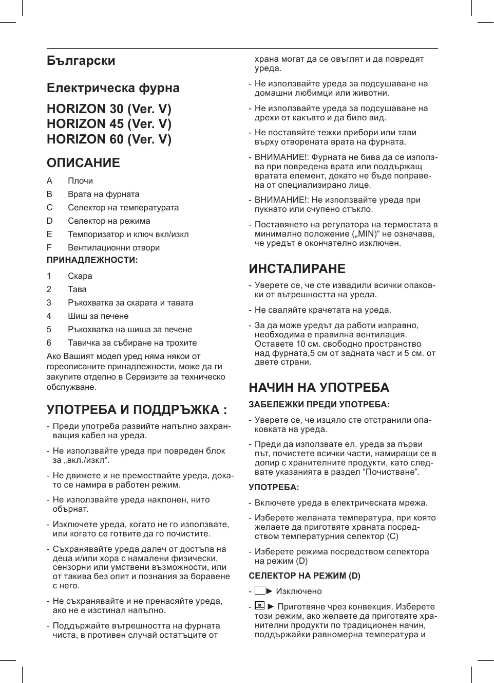 Téléchargez la notice de votre Електрическа фурна au format PDF gratuitement ! Retrouvez votre notice HORIZON 45 - TAURUS et reprennez votre appareil électronique en main. Sur cette page sont publiés tous les documents nécessaires à l'utilisation de votre appareil HORIZON 45 de la marque TAURUS.