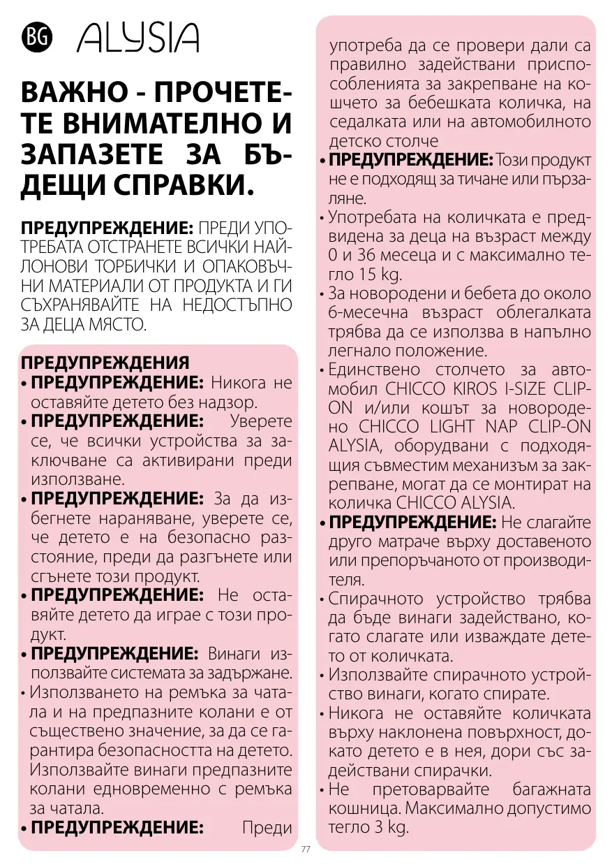 Téléchargez la notice de votre автомобилна седалка au format PDF gratuitement ! Retrouvez votre notice ALYSIA I-SIZE - CHICCO et reprennez votre appareil électronique en main. Sur cette page sont publiés tous les documents nécessaires à l'utilisation de votre appareil ALYSIA I-SIZE de la marque CHICCO.