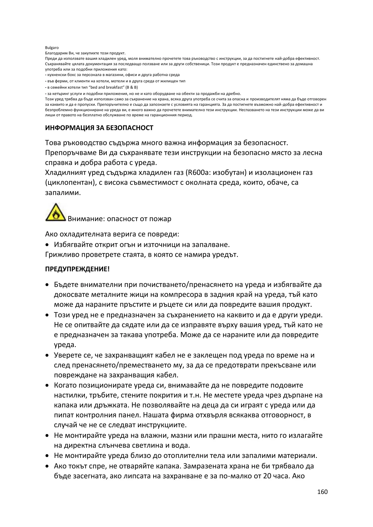 Bulgaro Благодарим Ви, че закупихте този продукт. Преди да използвате вашия хладилен уред, моля внимателно прочетете това ръководство с инструкции, за да постигнете най-добра ефективност. Съхранявайте цялата документация за последващо ползване или за други собственици. Този продукт е предназначен единствено за домашна употреба или за подобни приложения като: - кухненски бокс за персонала в магазини, офиси и друга работна среда - във ферми, от клиенти на хотели, мотели и в друга среда от жилищен тип - в семейни хотели тип “bed and breakfast” (B & B) - за кетъринг услуги и подобни приложения, но не и като оборудване на обекти за продажби на дребно. Този уред трябва да бъде използван само за съхранение на храна, всяка друга употреба се счита за опасна и производителят няма да бъде отговорен за каквито и да е пропуски. Препоръчително е също да запознаете с условията на гаранцията. За да постигнете възможно най-добра ефективност и безпроблемно функциониране на уреда ви, е много важно да прочетете внимателно тези инструкции. Неспазването на тези инструкции може да ви лиши от правото на безплатно обслужване по време на гаранционния период. ИНФОРМАЦИЯ ЗА БЕЗОПАСНОСТ Това ръководство съдържа много важна информация за безопасност. Препоръчваме Ви да съхранявате тези инструкции на безопасно място за лесна справка и добра работа с уреда. Хладилният уред съдържа хладилен газ (R600a: изобутан) и изолационен газ (циклопентан), с висока съвместимост с околната среда, които, обаче, са Внимание: опасност от пожар Ако охладителната верига се повреди: