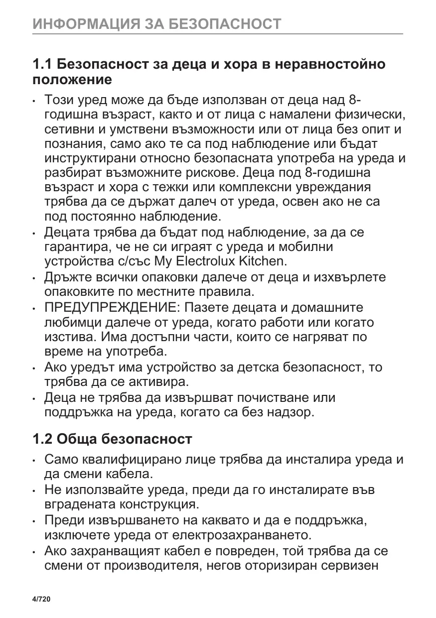 Veillez à ce que les enfants ne jouent pas avec l’appareil et les appareils mobiles avec My Electrolux Kitchen. Ne laissez pas les emballages à la portée des enfants et jetez-les convenablement. AVERTISSEMENT : tenez les enfants et les animaux éloignés de l'appareil lorsqu'il est en cours de fonctionnement ou lorsqu'il refroidit. Les parties accessibles deviennent chaudes en cours d'utilisation. Si l'appareil est équipé d'un dispositif de sécurité enfants, nous vous recommandons de l'activer. Le nettoyage et l'entretien par l'usager ne doivent pas être effectués par des enfants sans surveillance.