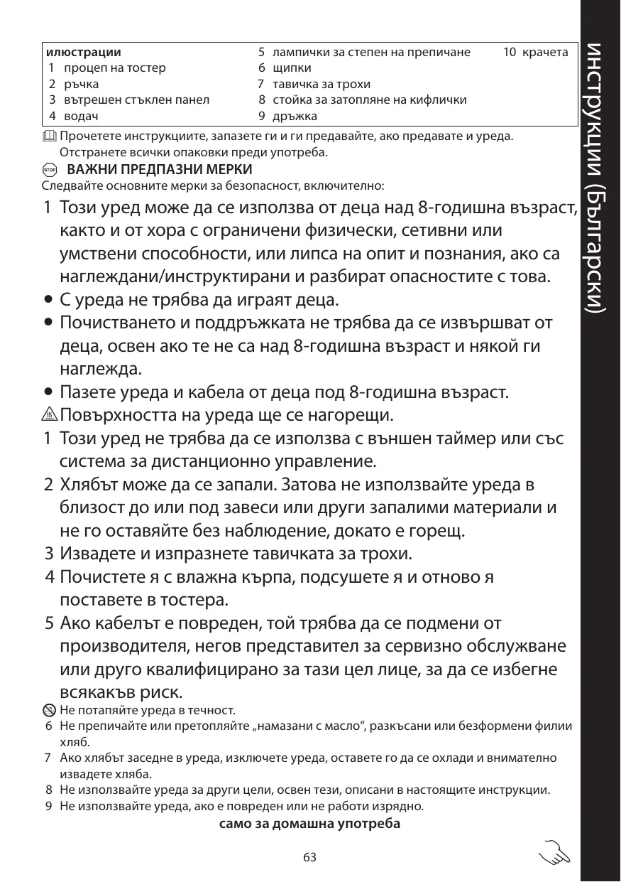 1 Този уред може да се използва от деца над 8-годишна възраст, както и от хора с ограничени физически, сетивни или умствени способности, или липса на опит и познания, ако са наглеждани/инструктирани и разбират опасностите с това. • С уреда не трябва да играят деца. • Почистването и поддръжката не трябва да се извършват от деца, освен ако те не са над 8-годишна възраст и някой ги наглежда. • Пазете уреда и кабела от деца под 8-годишна възраст. h Повърхността на уреда ще се нагорещи. 1 Този уред не трябва да се използва с външен таймер или със система за дистанционно управление. 2 Хлябът може да се запали. Затова не използвайте уреда в близост до или под завеси или други запалими материали и не го оставяйте без наблюдение, докато е горещ. 3 Извадете и изпразнете тавичката за трохи. 4 Почистете я с влажна кърпа, подсушете я и отново я поставете в тостера. 5 Ако кабелът е повреден, той трябва да се подмени от производителя, негов представител за сервизно обслужване или друго квалифицирано за тази цел лице, за да се избегне всякакъв риск. L Не потапяйте уреда в течност. 6 Не препичайте или претопляйте „намазани с масло“, разкъсани или безформени филии хляб. 7 Ако хлябът заседне в уреда, изключете уреда, оставете го да се охлади и внимателно извадете хляба. 8 Не използвайте уреда за други цели, освен тези, описани в настоящите инструкции. 9 Не използвайте уреда, ако е повреден или не работи изрядно.