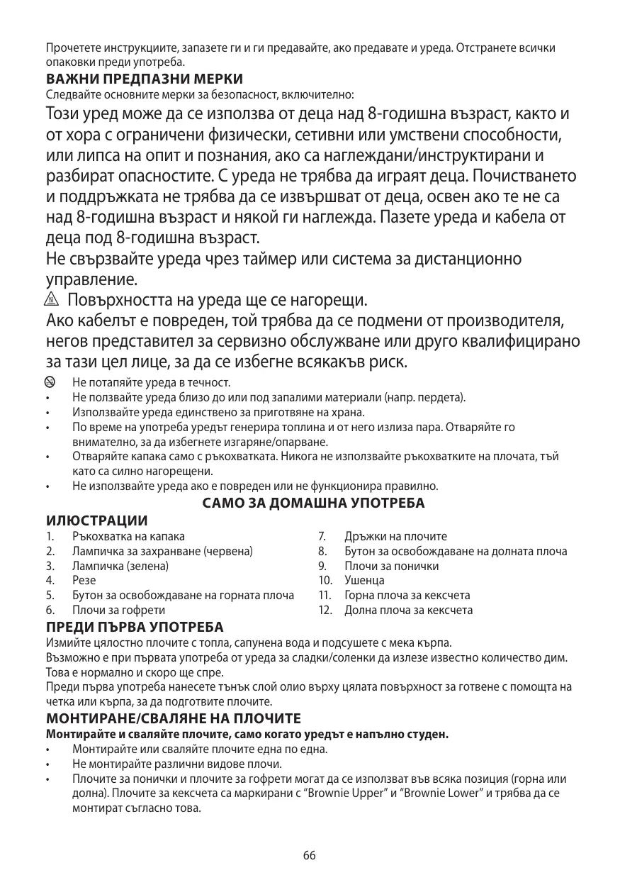 Монтирайте и сваляйте плочите, само когато уредът е напълно студен. • Монтирайте или сваляйте плочите една по една. • Не монтирайте различни видове плочи. • Плочите за понички и плочите за гофрети могат да се използват във всяка позиция (горна или долна). Плочите за кексчета са маркирани с “Brownie Upper” и “Brownie Lower” и трябва да се монтират съгласно това. 66