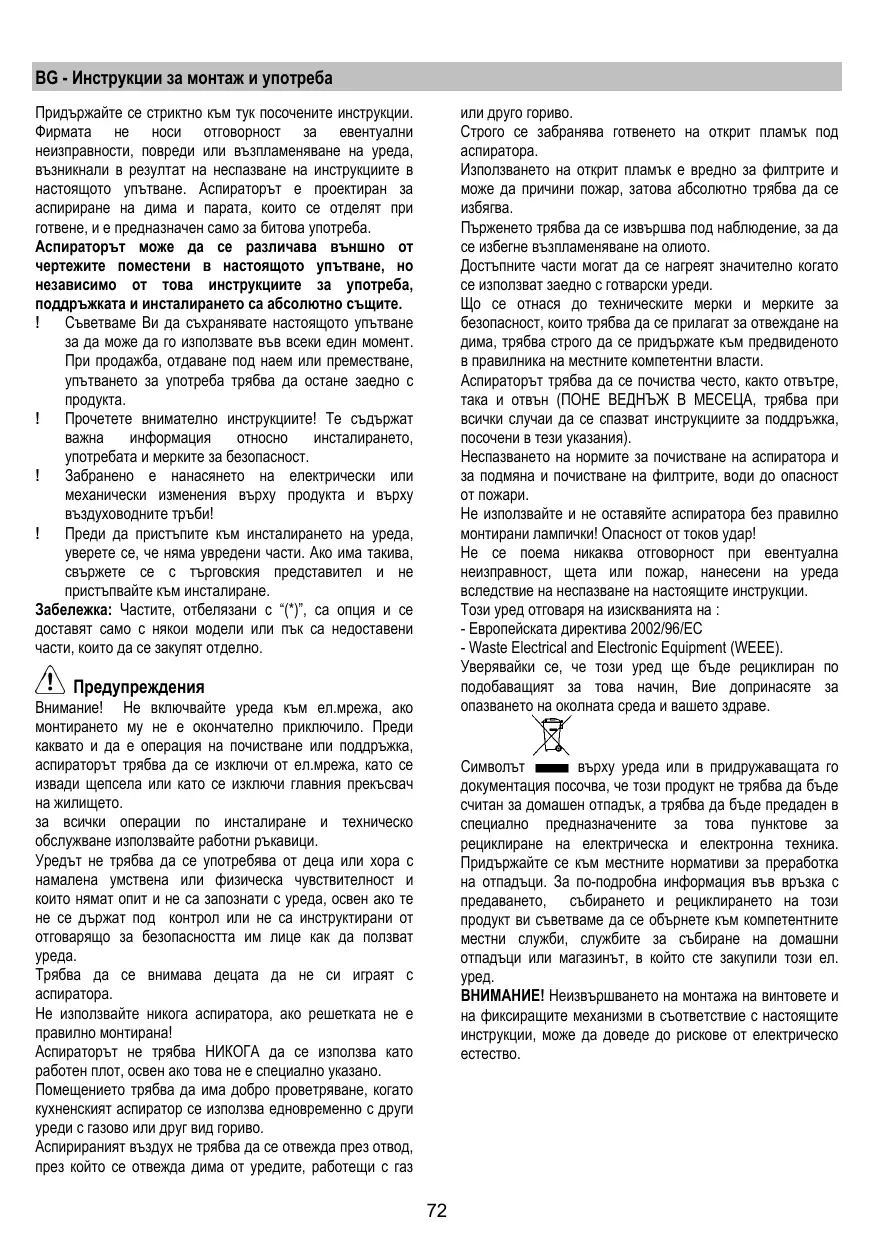Atención!No conectar el aparato a la red eléctrica hasta que la instalación fue completada. Antes de cualquier operación de limpieza o mantenimento, desenchufar la campana o el interruptor general de la casa. Todas las operaciones de instalación y mantenimiento se deben realizar utilizando guantes de trabajo. El aparato no está destinado para el uso por parte de los niños o personas con problemas fisicos o mentales y sin experiencia y conocientos a menos que no sea bajo la supervisión de profesionales ,o por una persona responsable de su seguridad. Los niños deben ser controlados para evitar que jueguen con el aparato. Nunca utilizar la campana sin la parrilla correctamente montada! La campana no debe ser nunca utilizada como plano de apoyo solo si es expresamente indicado. El ambiente debe poseer suficiente ventilación, cuando la campana de cocina es utilizada conjuntamente con otros aparatos a gas u otros combustibles. El aire aspirado no debe ser mezclado en un conducto para descarga de humo producidos por aparatos a gas u otros combustibles. Es prohibido cocinar alimentos con llama alta por debajo de la campana. El uso de las llamas libres puede provocar daños a los filtros y dar lugar a incendios, por lo tanto evitar en cada caso. Las frituras deben ser cocinadas bajo control para evitar que el aceite recalentado prenda fuego. Las partes accessibles pueden calentarse cuando se usan El uso de tubos u orificios de escape de pared con diámetro