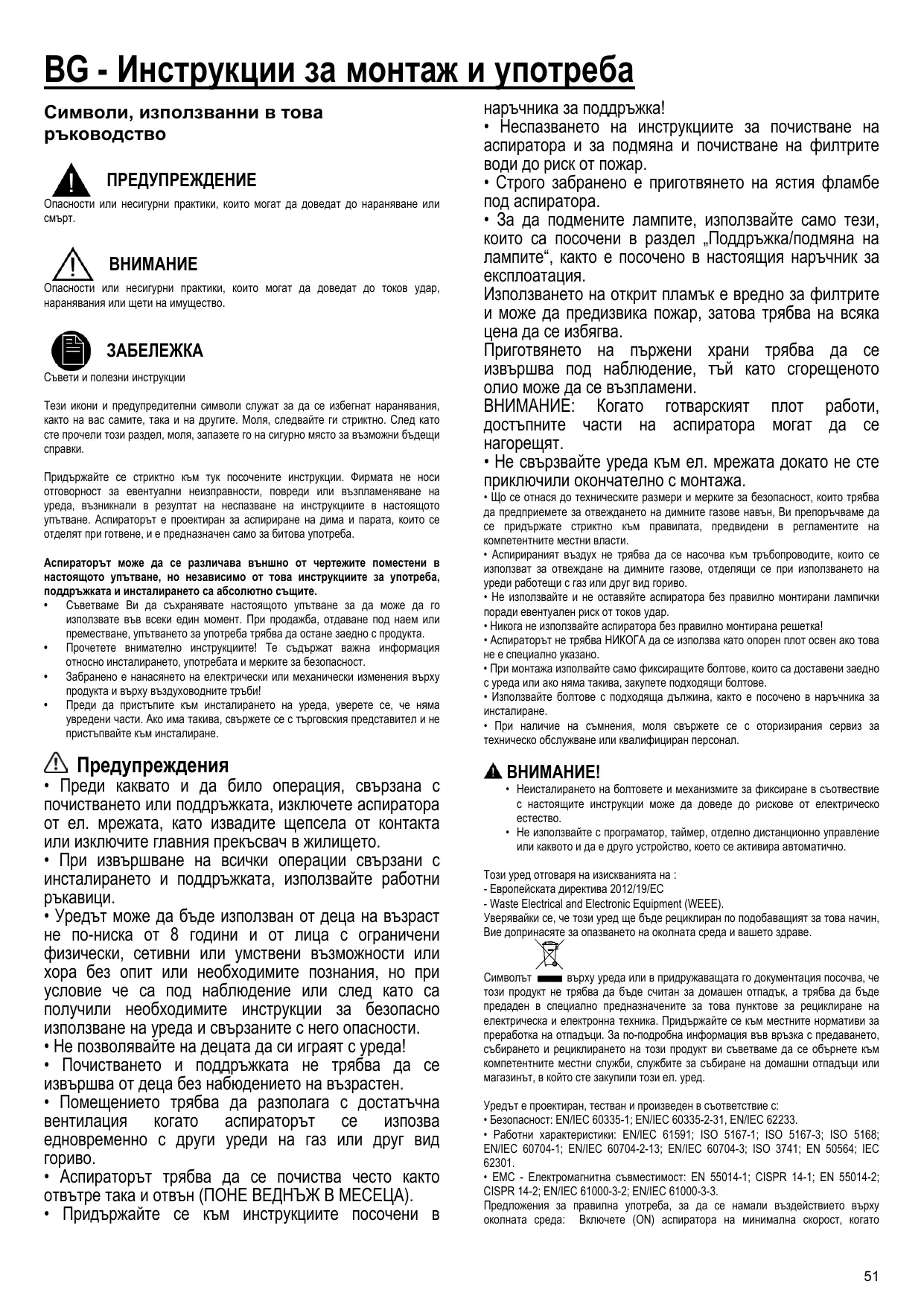Символът върху уреда или в придружаващата го документация посочва, че този продукт не трябва да бъде считан за домашен отпадък, а трябва да бъде предаден в специално предназначените за това пунктове за рециклиране на електрическа и електронна техника. Придържайте се към местните нормативи за преработка на отпадъци. За по-подробна информация във връзка с предаването, събирането и рециклирането на този продукт ви съветваме да се обърнете към компетентните местни служби, службите за събиране на домашни отпадъци или магазинът, в който сте закупили този ел. уред. Уредът е проектиран, тестван и произведен в съответствие с: • Безопасност: EN/IEC 60335-1; EN/IEC 60335-2-31, EN/IEC 62233. • Работни характеристики: EN/IEC 61591; ISO 5167-1; ISO 5167-3; ISO 5168; EN/IEC 60704-1; EN/IEC 60704-2-13; EN/IEC 60704-3; ISO 3741; EN 50564; IEC 62301. • EMC - Електромагнитна съвместимост: EN 55014-1; CISPR 14-1; EN 55014-2; CISPR 14-2; EN/IEC 61000-3-2; EN/IEC 61000-3-3. Предложения за правилна употреба, за да се намали въздействието върху околната среда: Включете (ON) аспиратора на минимална скорост, когато